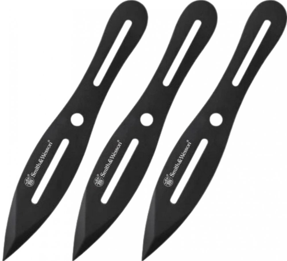 Smith & Wesson® sada 3 vrhacích nožů o délce 8" je vyrobena z nerezové oceli s oboustranně broušenými spear point čepelemi. Součástí balení je černé polyesterové pouzdro na opasek.