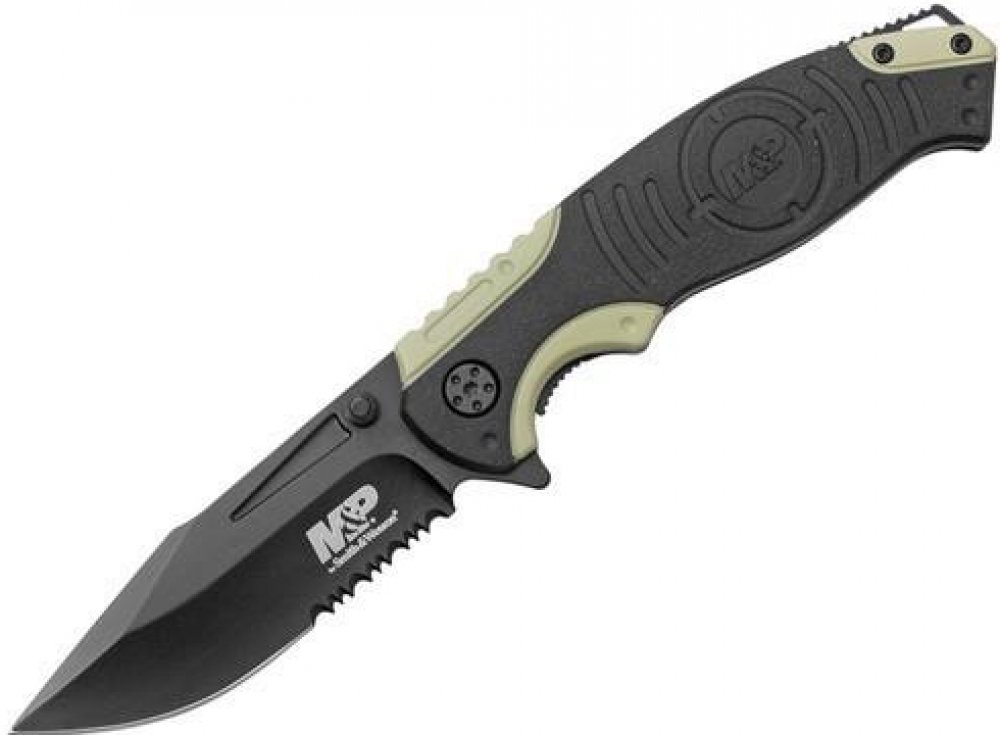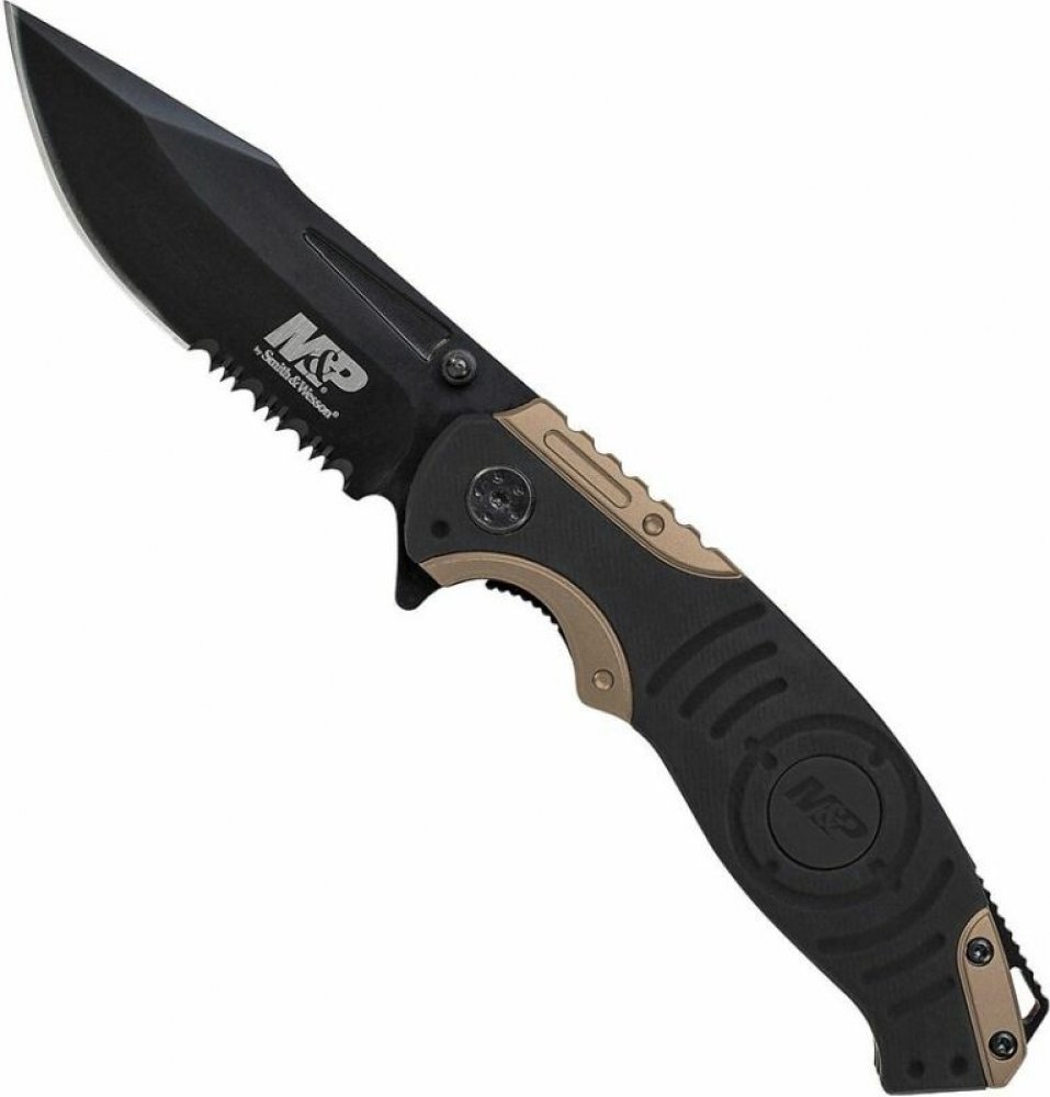 univerzálně použitelný zavírací nůž od Smith & Wesson lehký a štíhlý nůž velmi dobře tvarovaná rukojeť s gumovými střenkami čepel je vyrobena z kvalitní nerezové oceli 8Cr13MoV o tvrdosti 58 - 60 HRC, má černou povrchovou úpravu a částečně zoubkované ostří jednoduché otevírání - zatlačením na flipper nebo kolíček na čepeli pojistka linerlock kapesní klips a otvor na závěsnou šňůru