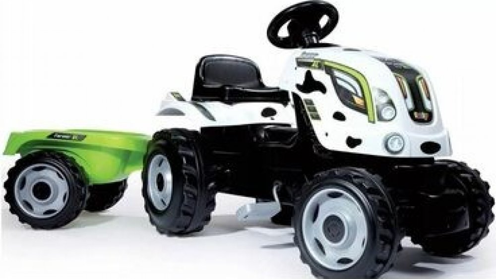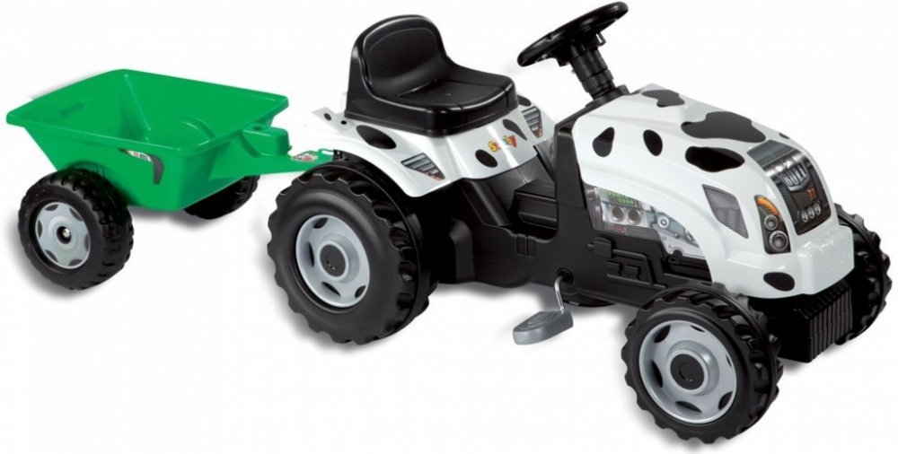 Výborným doplňkem traktoru Smoby je odpojitelný přívěs v zadní části, na který si děti mohou naložit svůj náklad. Zadní vlečka má 2 kolečka, v případě potřeby se dá odpojit. Traktor má řetězový pohon, jeho nosnost je 30 kg. Výška sedací plochy je 37 cm, dítě nesedí vysoko nad zemí. Délka traktoru je 141 cm. Má pevnou plastovou konstrukci. Kola traktoru jsou ovládána pomocí volantu, přesně jako na opravdovém traktoru. Jízda na traktoru je velmi zábavná hra, ale pomáhá také s fyzickým rozvojem dítěte. Děti manipulací s volantem rozvíjejí svou jemnou motoriku, šlapáním pedálů se posiluje svalstvo na nohou. Hra na traktoristy také rozvíjí dětskou fantazii a představivost.