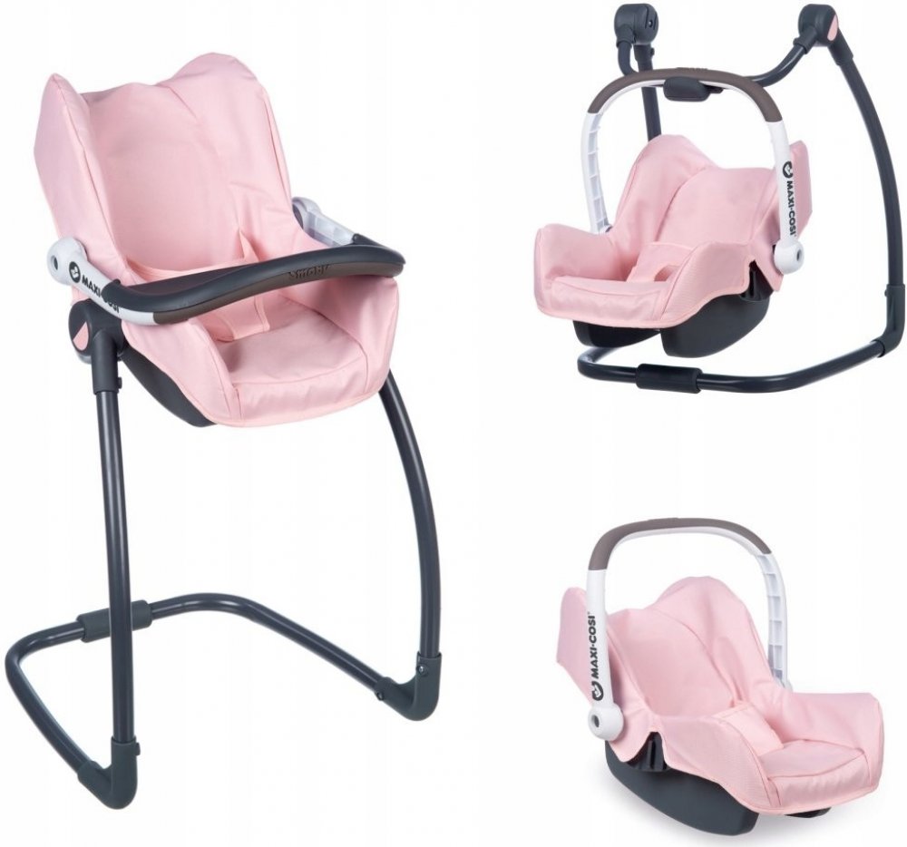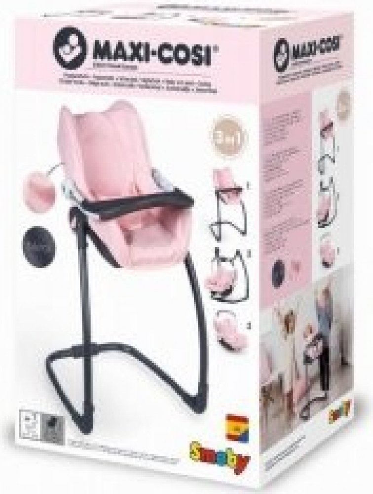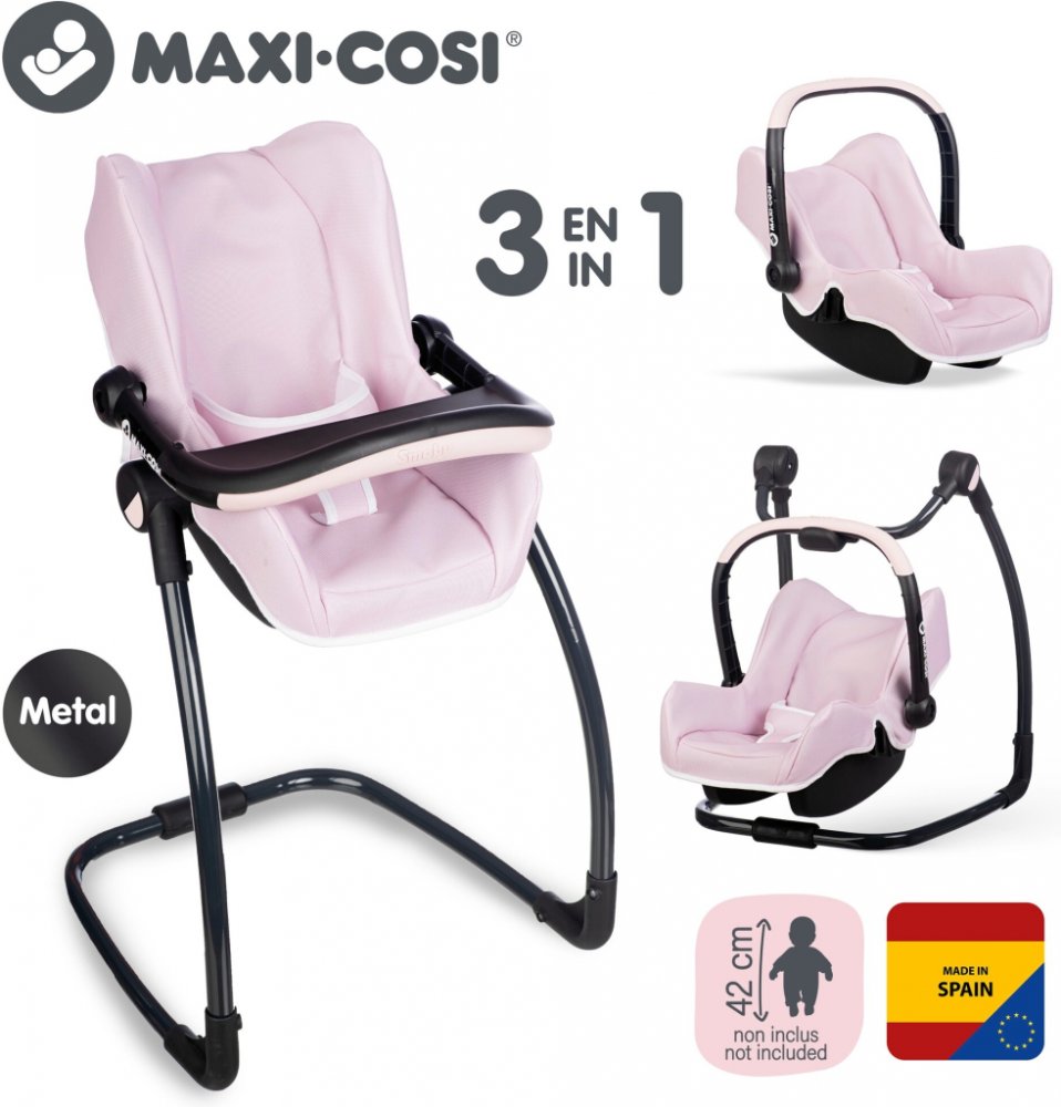 Autosedačka Maxi-Cosi 3 v 1 pro panenky. Při zavěšení sedačky na konstrukci je rázem houpačka pro panenku do velikosti 42 cm. Otočením konstrukce získáte vysokou jídelní židličku s pultíkem. Rozměry: 43 x 72 x 41 cm. Hmotnost 2,31 kg.