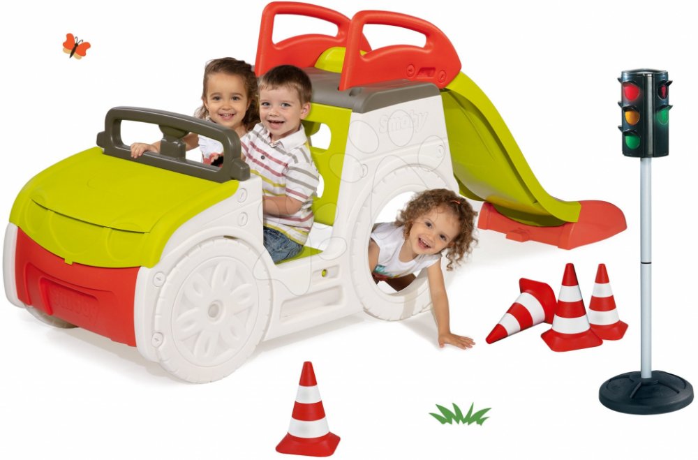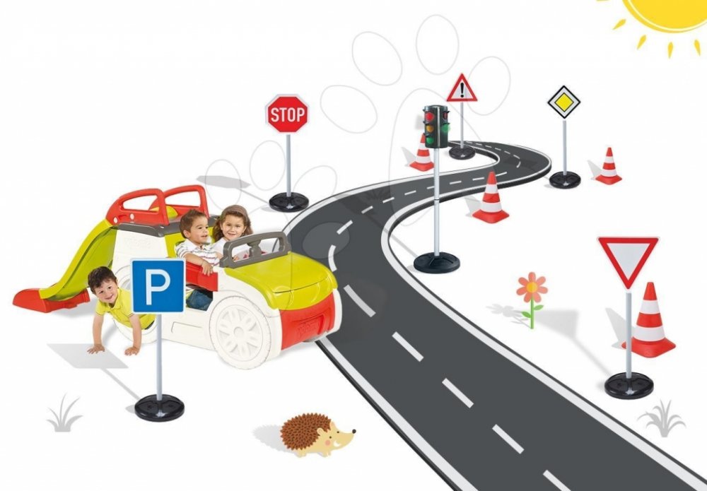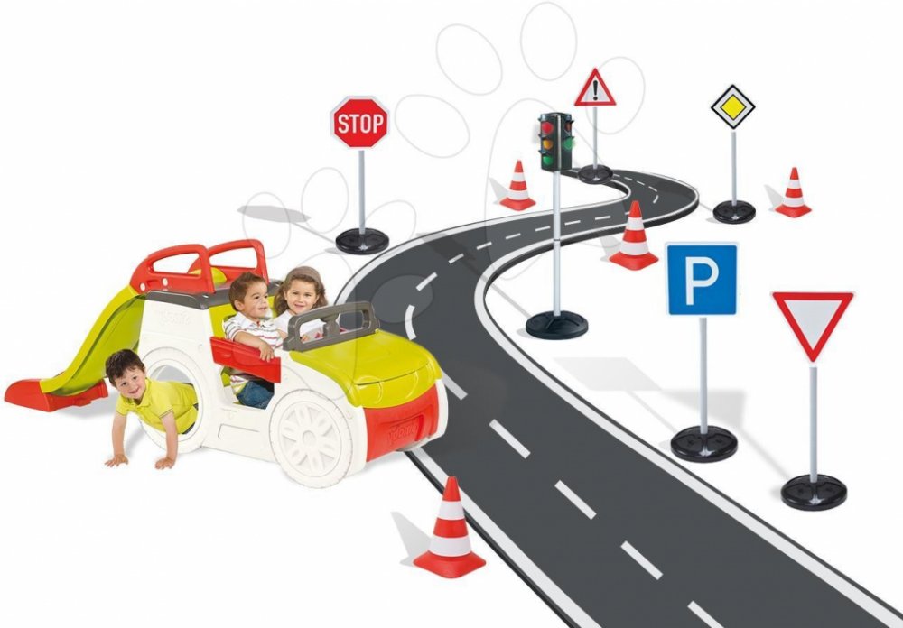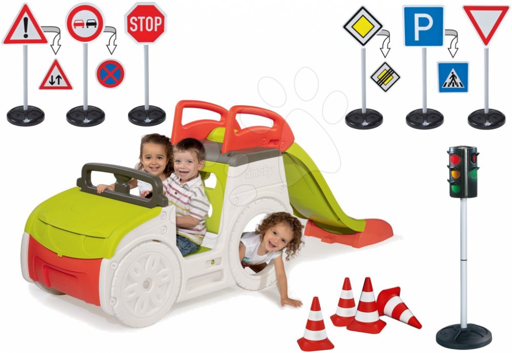 SMOBY 840200-14 preliezačka Adventure Car s pieskoviskom a šmykľavkou + automatický semafor+dopravné značky+cestné kužele
