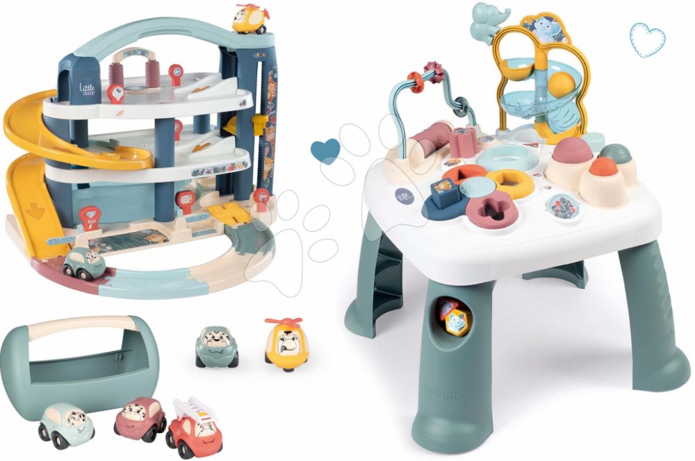 Smoby Activity Table Little a garáž 3patrová s výtahem a kufřík na nářadí s autíčky