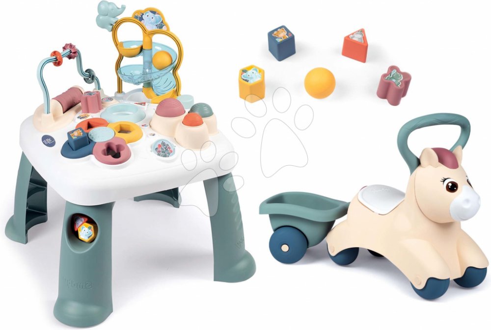 Didaktický stolek Activity Table a odrážedlo s přívěsem Pony představují skvělé hračky pro všechny děti od 12 měsíců. Hračky v setu od francouzského výrobce Smoby spolu barevně a designově ladí, ozdobí každý dětský pokojíček. Hračky v nejvyšší kvalitě dokážou hravým způsobem rozvíjet schopnosti dětí. Vaši nejmenší se na stolku zabaví s různými aktivitami, které přímo rozvíjejí jejich kognitivní schopnosti a logické myšlení. Těšit se mohou také na originální odrážedlo s přívěsem, do kterého si mohou vložit své oblíbené hračky.