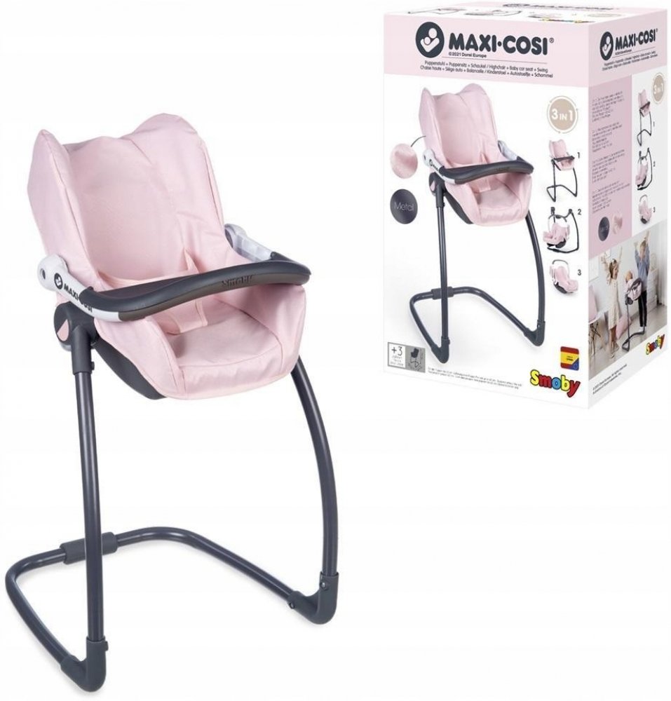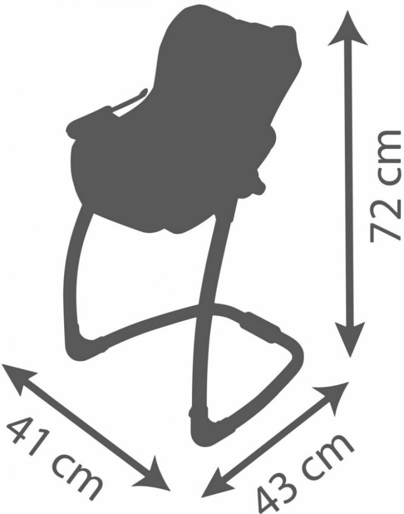 Při zavěšení sedačky na konstrukci je rázem houpačka pro panenku do velikosti 42 cm. Otočením konstrukce získáte vysokou jídelní židličku s pultíkem. Samostatně jako autosedačku na cestování.