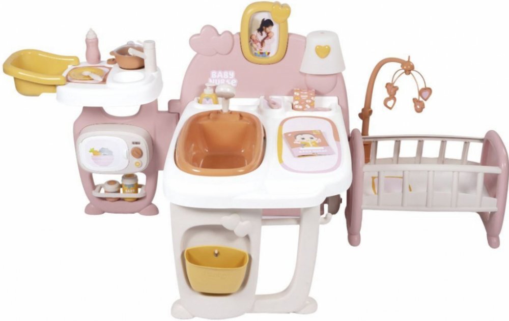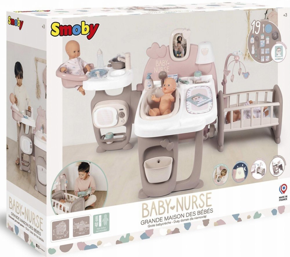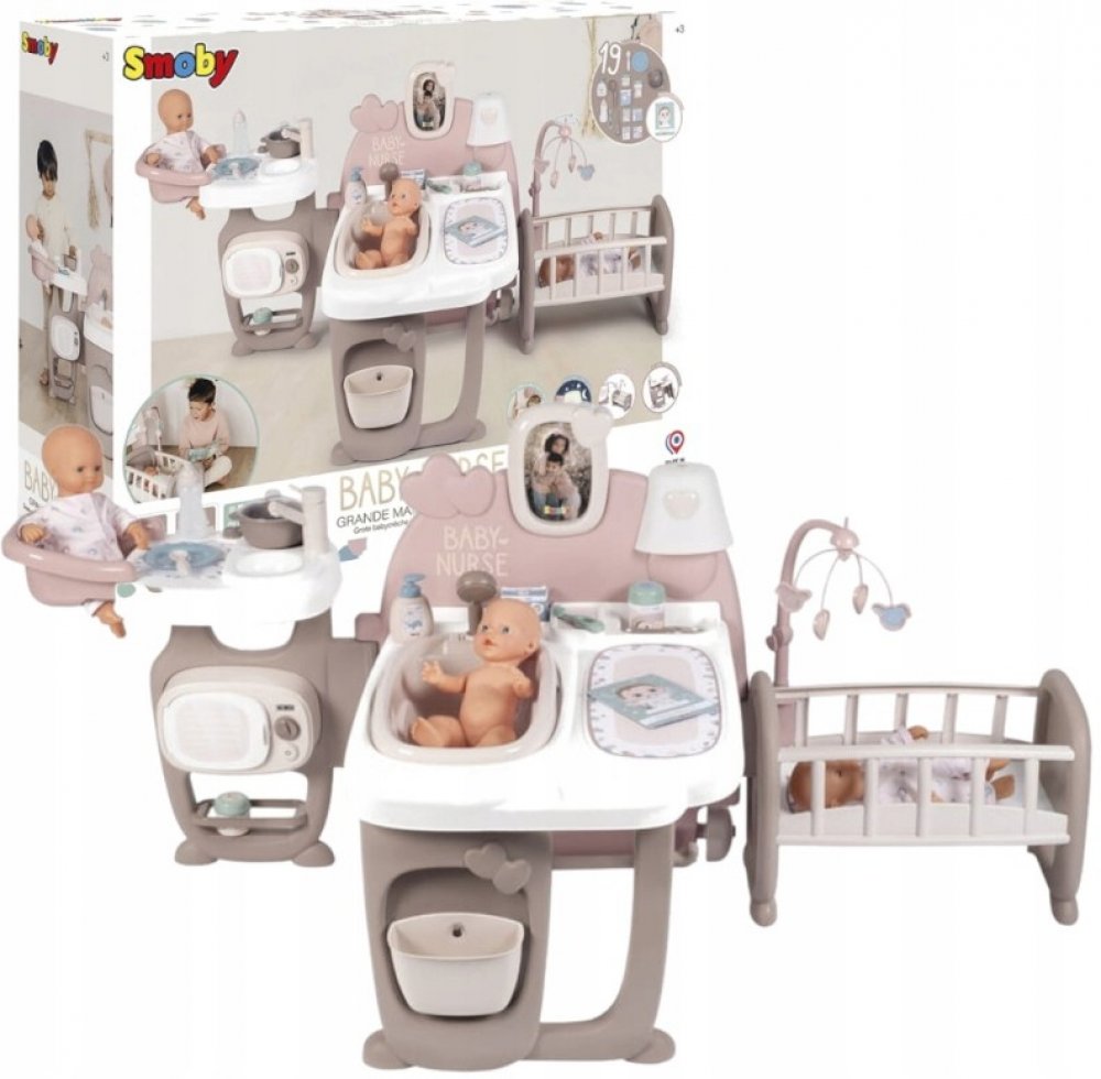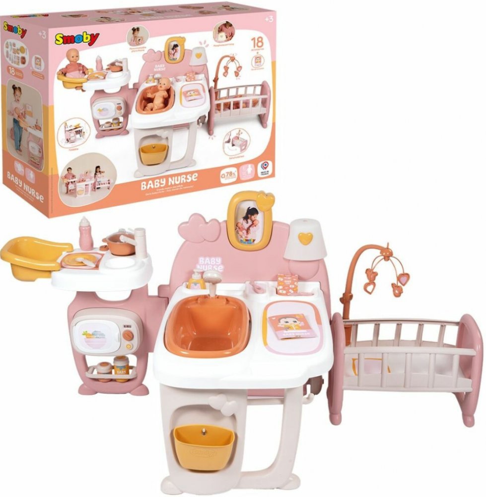 Baby Nurse Hrací centrum pro panenky Hrací centrum pro panenky Baby Nurse se 3 hracími zónami je vybaveno transportními kolečky, rukojetí a je skládací pro snadnou přepravu. Po otevření překvapí třemi prostornými hracími koutky: kuchyňkou, koupelnou a ložnicí. Mycí prostor je vybaven odnímatelnou vaničkou, hned vedle je přebalovací pult, který zároveň slouží jako šatna. Pod komodou je věšák na ručníky, háček na kabát a vyjímatelný odpadkový koš. Rám obrazu na zadní stěně lze přizpůsobit vlastními fotografiemi. Jídelní kout se sedátkem pro panenky má dřez s baterií (nefunkční), varnou desku, mikrovlnnou troubu a odkládací police. Spací část obsahuje postýlku pro panenky, otočný kolotoč a fosforeskující lampu. Příslušenství: lahvičky, talíře se lžičkami, hrnce, klinické teploměry a různé nádoby a prázdné obaly na hraní. Vhodné pro panenky do 42 cm. Panenka není součástí balení. Parametry: