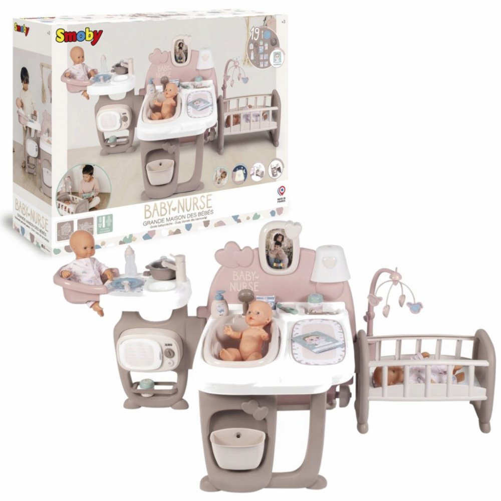 Baby Nurse Hrací centrum pro panenky Hrací centrum pro panenky Baby Nurse se 3 hracími zónami je vybaveno transportními kolečky, rukojetí a je skládací pro snadnou přepravu. Po otevření překvapí třemi prostornými hracími koutky: kuchyňkou, koupelnou a ložnicí. Mycí prostor je vybaven odnímatelnou vaničkou, hned vedle je přebalovací pult, který zároveň slouží jako šatna. Pod komodou je věšák na ruč...