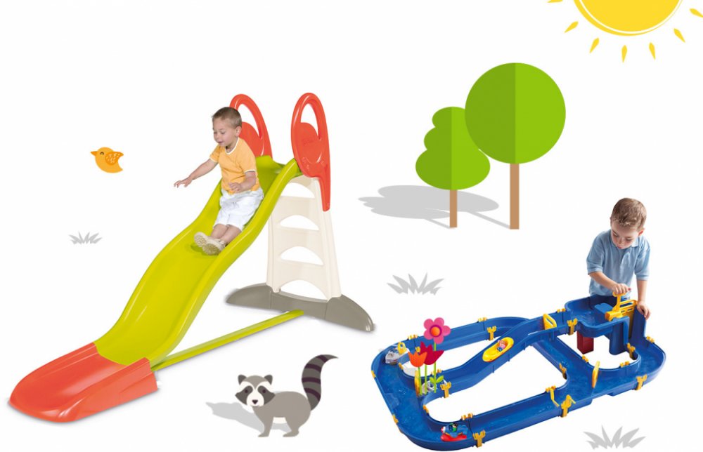 Smoby je špičkový francouzský výrobce, který se již léta pyšní výrobou kvalitních a originálních plastových hraček. Další renomovaný výrobce je německý producent Big, který vyrábí stejně kvalitní, bezpečné a jedinečné hračky z plastu. Big nabízí na své hračky nadstandardní záruku 3 roky. Hračky mají zaoblené hrany, aby byly děti při hrách chráněny. Plast na hračkách je jemný k dětským ručkám, je to plast sametový na dotek. Hračky splňují i ty nejpřísnější evropské standardy. S hračkami v tomto úžasném cenově výhodném setu se vaše děti nikdy nebudou nudit. Skluzavka, která se snadno změní na tobogán je něco, po čem touží každé malé děťátko. S vodní hrou se děti zahrají i v domě, když bude venku ošklivé počasí.