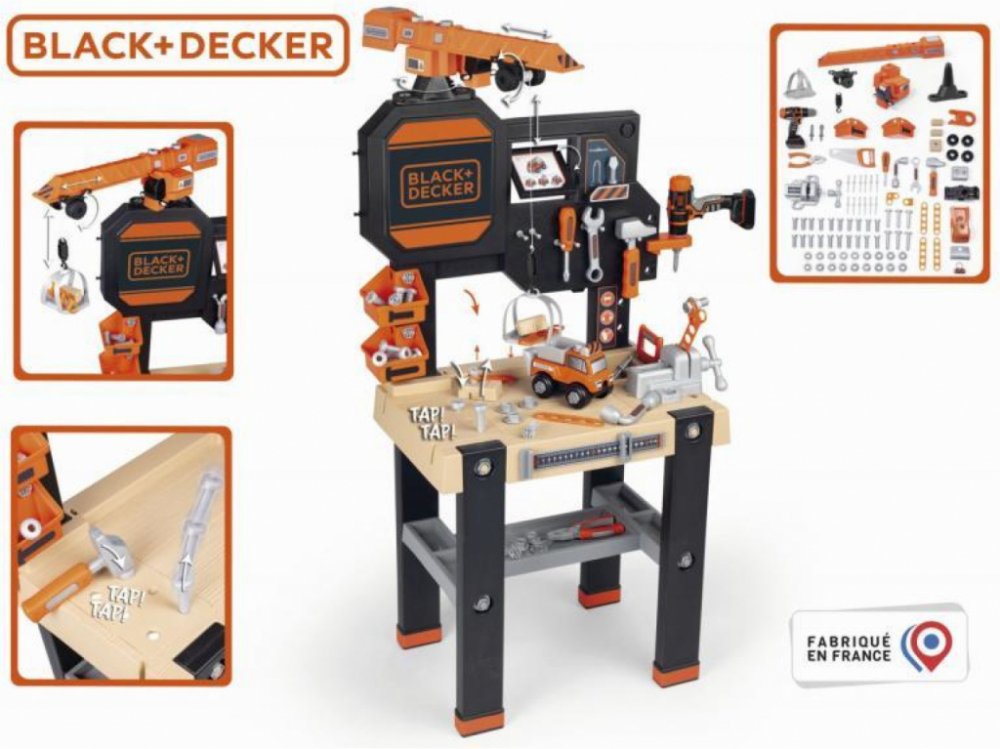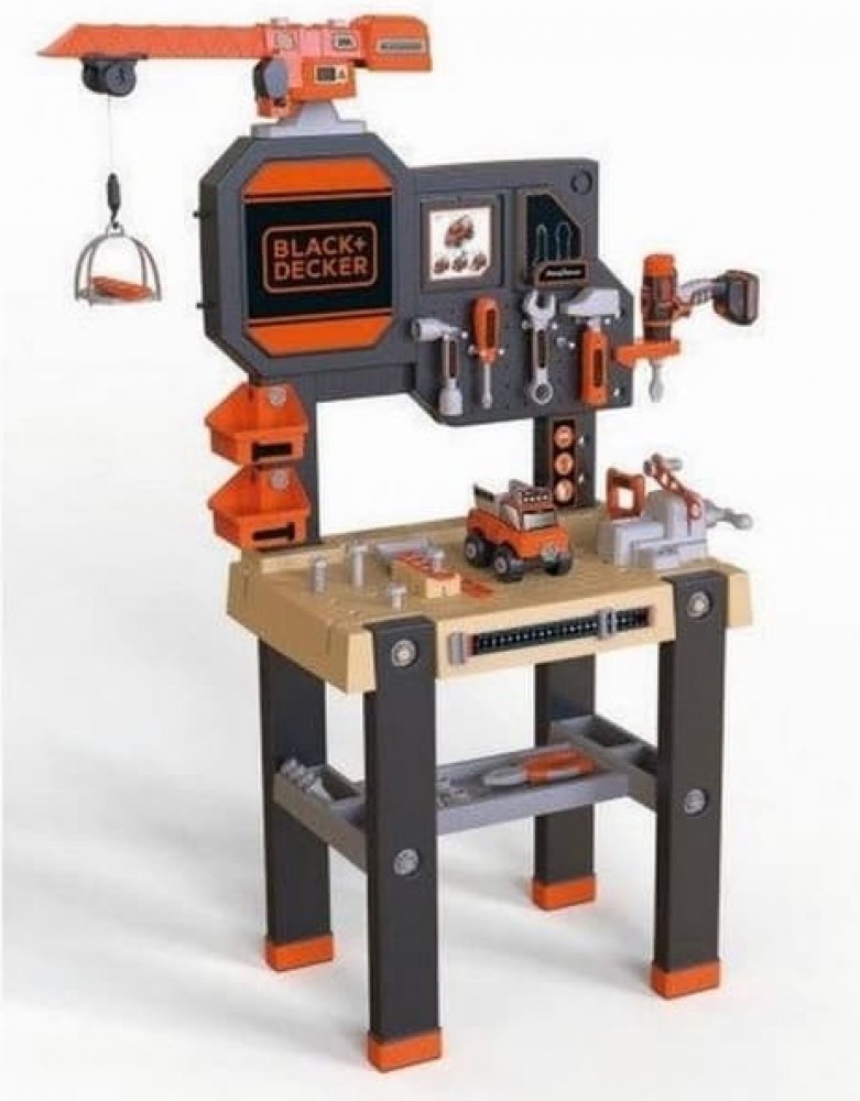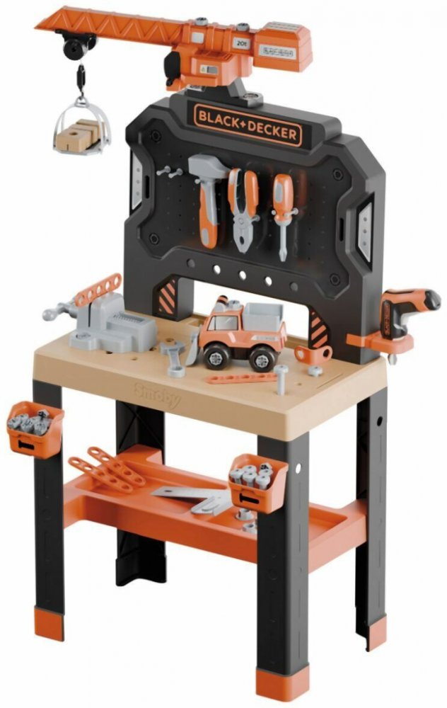 Black+Decker - Velká pracovní dílna s jeřábem Velký, stabilní dětský pracovní stůl v originálním designu Black+Decker s velkým otočným jeřábem, mechanickým aku šroubovákem, spoustou nářadí a příslušenství a stavebnicí auta. Velká pracovní plocha v designu dřeva a četné odkládací přihrádky nabízejí dostatek místa pro širokou škálu příslušenství. Kromě mechanického akumulátorového šroubováku je na přední straně kladívko, klíč na kola, šroubovák, klíč, kleště a pila a také velká svorka a posuvné pravítko. Zábavná funkce zatloukání hřebíků zajistí spousty zábavy. Se stavebnicí mohou malí mechanici sestavit skutečné auto v několika jednoduchých krocích. Vybavení doplňují šrouby, matice, hřebíky a různé upevňovací materiály. Rozšiřitelné a kompatibilní se všemi nástroji Black + Decker od Smoby. Parametry: