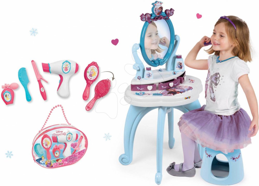 Všechny plastové díly na kosmetickém stolku jsou vyrobeny se zaoblenými hranami s ohledem na bezpečnost vašeho dítěte. Součástí stolku je také nastavitelné zrcadlo s pohádkovým emblémem, které je vyrobeno z kvalitního materiálu, bezpečného pro dítě. Všechny kosmetické pomůcky lze odložit do praktických zásuvek pod zrcadlem. Holčičky si budou moci dosyta poohlížet svůj odraz, starat se o své vlásky a s kamarádkami si zahrají hru na povolání kosmetičky, přibližují se světu dospělých.