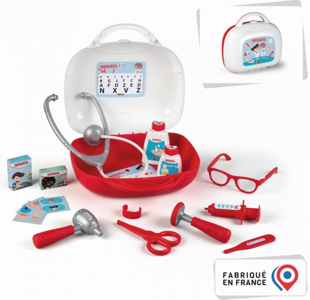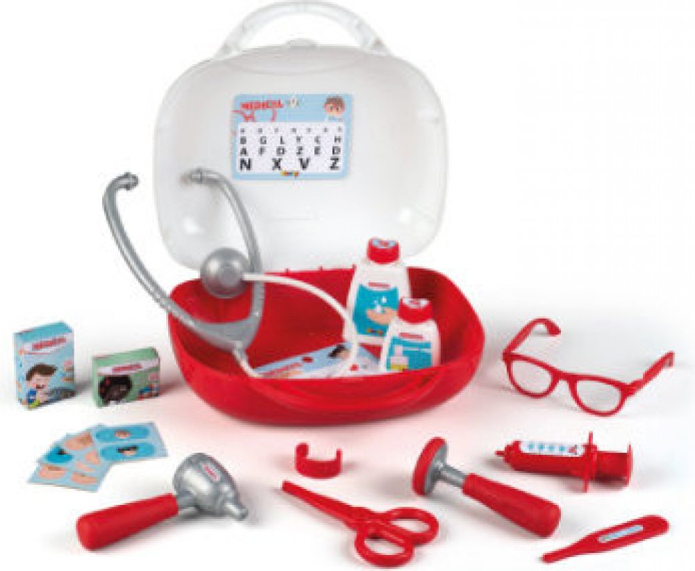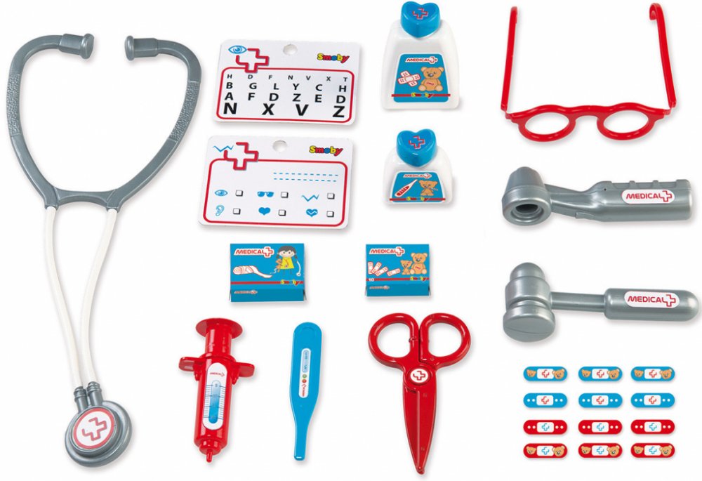 Sada obsahuje až 13 doplňků, např. stetoskop, injekční stříkačku, brýle a teploměr. Kufr zaručuje skvělou zábavu.