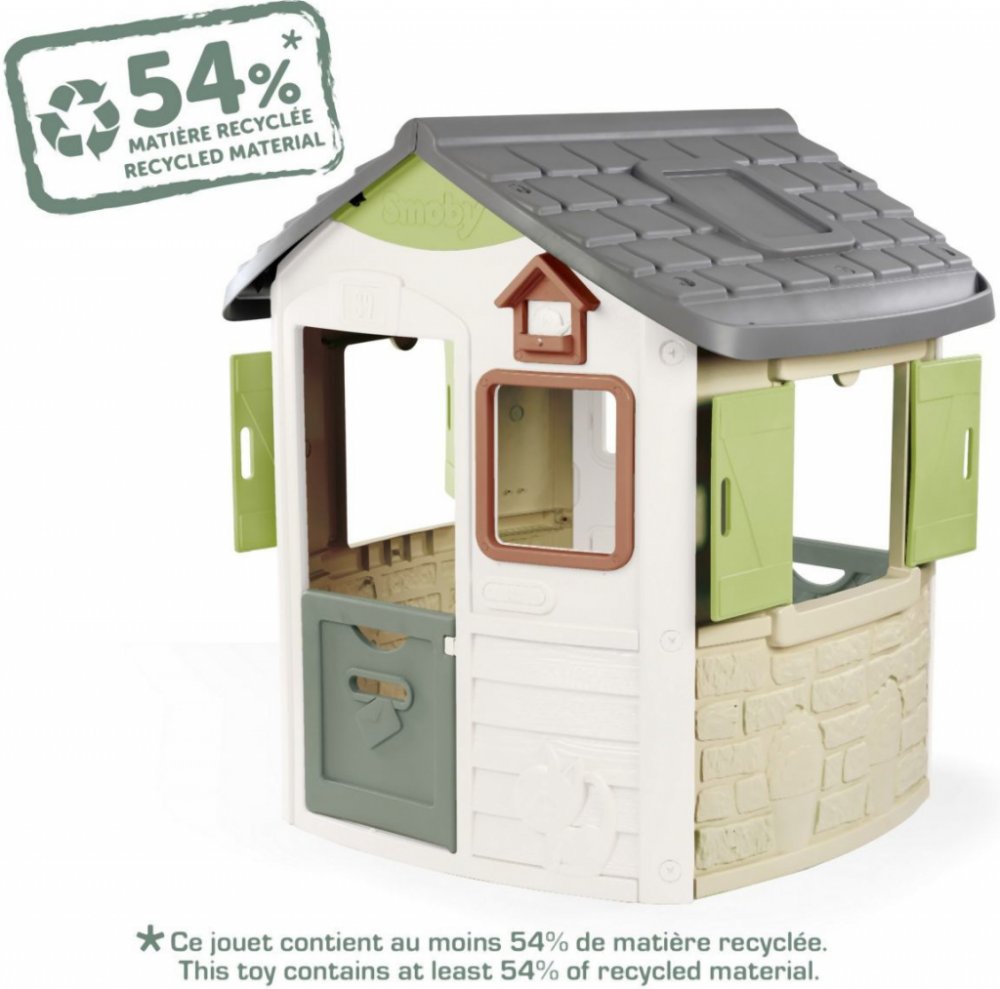 Domek je vyrobený z vysoce kvalitního a odolného plastu, kterému neublíží UV záření a ani povětrnostní vlivy. Jeho barvy navíc jen tak nevyblednou. Mají dlouhou trvanlivost. Domeček obsahuje minimálně 53 % recyklovaného materiálu. Je recyklovatelný, takže je šetrnější k životnímu prostředí.
