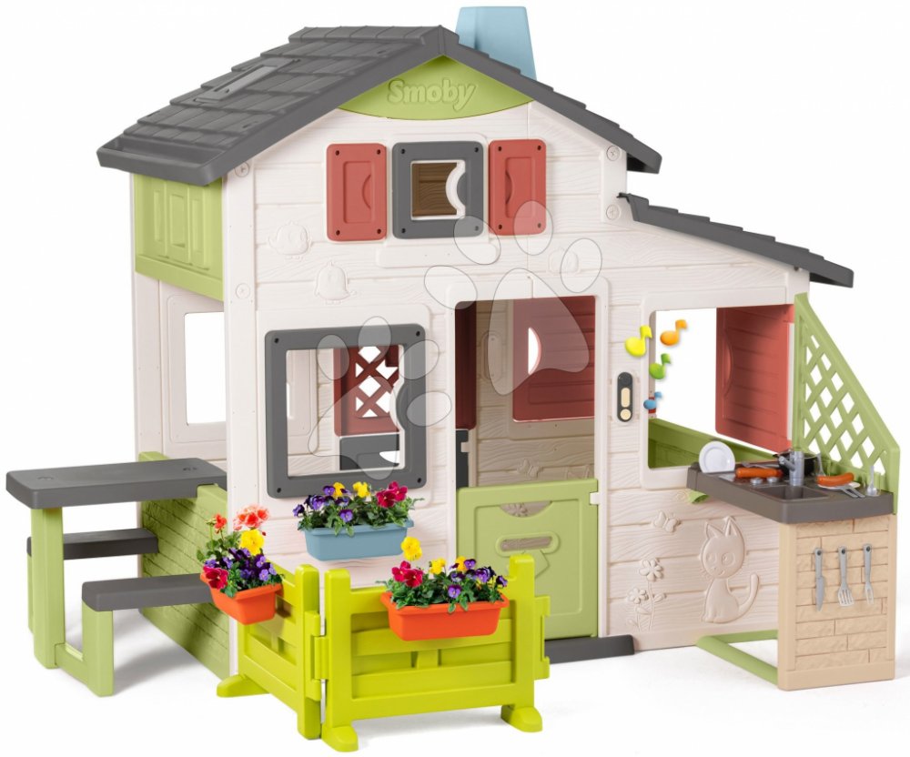 Domeček Friends House je velmi prostorný a vzdušný. V jeho přední části jsou otevíratelná poloviční dvířka s poštovní schránkou, 2 velká okna a 1 okénko pod střechou a chybět nesmí ani elektronický zvonek. Před vstupem do domku se nachází zahrádka s květináči, do kterých si mohou děti zasadit kytičky. Z druhé strany dveří děti upoutá praktická zahradní kuchyňka se 17 doplňky, mezi nimiž najdou talířky, příbory, nožík, napichovací vidličku, lopatku na míchání, hrnec, kelímky a párky, které nabídnou sourozencům a kamarádům. Kuchyňka je vybavena v zadní části dekorativní ozdobnou mřížkou a s vnitřní částí je propojena otevíratelným okénkem, přes které se dá servírovat připravené jídlo.