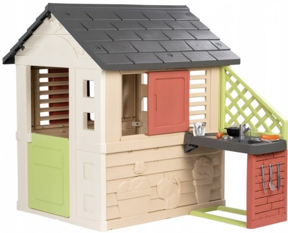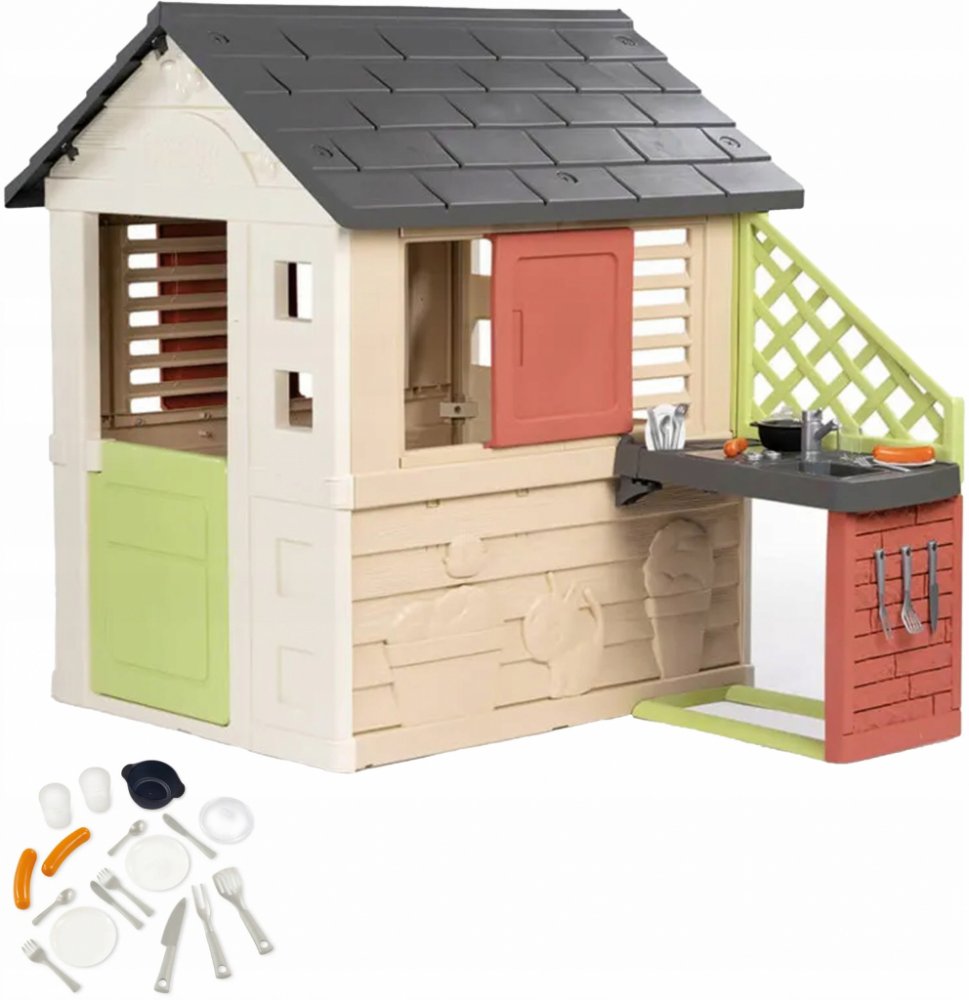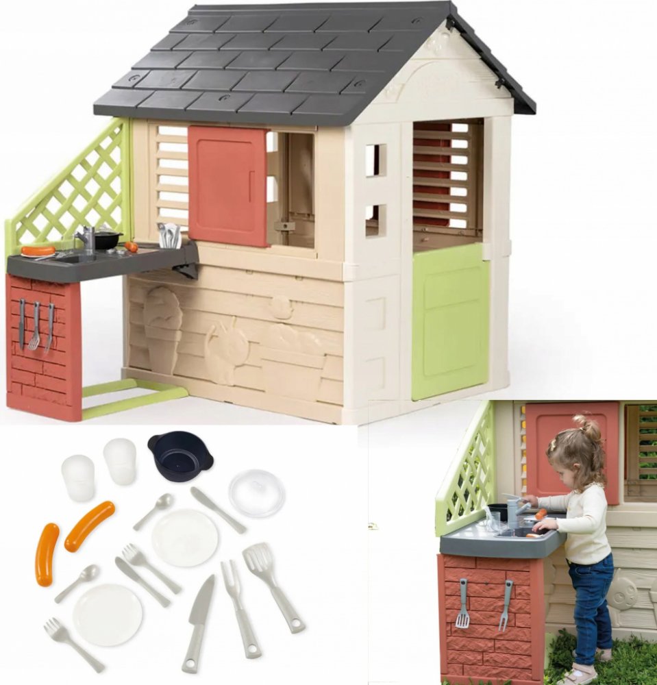 Stabilní, prostorný domeček Smoby Life Nature se skvělou letní kuchyňkou nabízí spoustu zábavy pro nejmenší. Kuchyňka je připevněna ke vnější stěně, má dřez s kohoutkem (nefunkční), grilovací desku na vaření a grilování a polici na nádobí. Zážitek z vaření doplňují 2 sklenice, 2 talíře, různé kuchyňské náčiní, klobásy a malý rendlík. Snadná montáž. Módní barevné provedení v tyrkysové a zelené dodá...