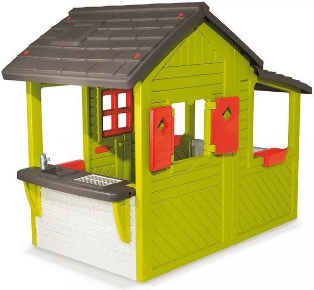 Jedinečným prvkem domku je i zvonek na dveřích a poloviční dveře. Domečky pro děti Smoby patří k nejkvalitnějším na trhu, díky své vysoké odolnosti a kvalitě. Požitek ze hry v domku je jedinečný díky důslednému ergonomickému řešení a děti mají uvnitř hodně místa na hraní. Hra v dětském domku u dětí rozvíjí komunikační schopnosti a pomocí her napodobují dospělé.