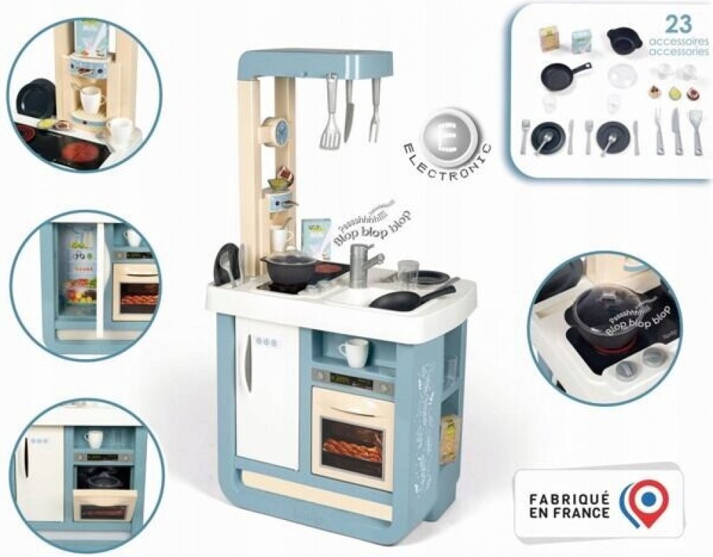 Kompaktní a realistická dětská kuchyňka, která je celá navržena v moderním designu současných kuchyní. Díky krásnému zbarvení v jemných pastelových tónech se hodí do dětského pokoje i do společného obývacího pokoje. Kuchyňka má sporák se dvěma plotýnkami, troubu a digestoř. Elektronický zvukový modul v jedné z plotýnek poskytuje realistické zvuky vaření. Výbavu doplňují lednice, dřez s kohoutkem a espresso kávovar s různými kapslemi na čaj a kávu. Rozsáhlé příslušenství lze snadno uložit do jedné z mnoha polic. Součástí vybavení je rendlík s poklicí, talíř, příbory, nádobí, makety obalů od jídla, hrnek, hrnek a pánev.