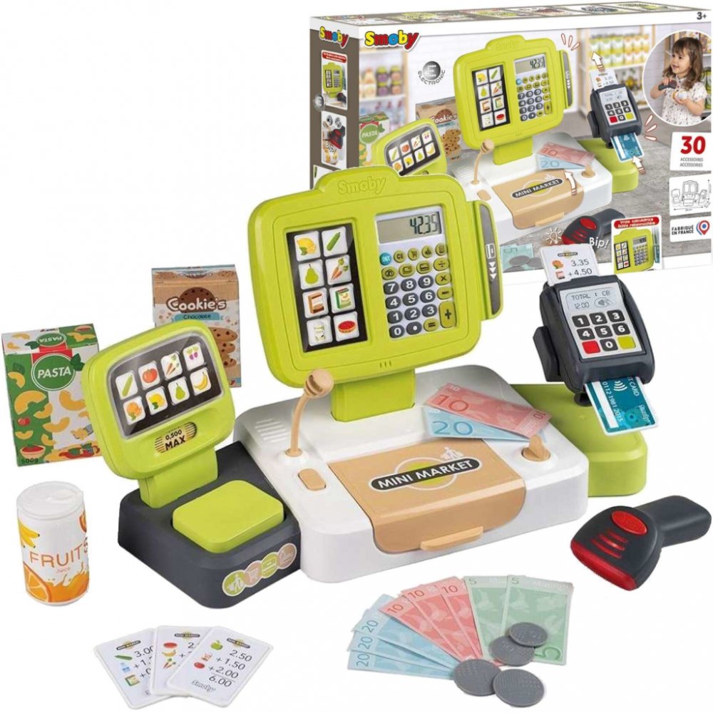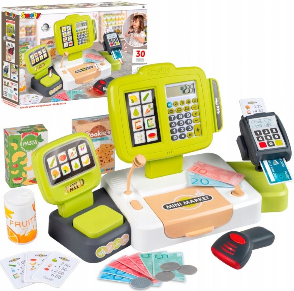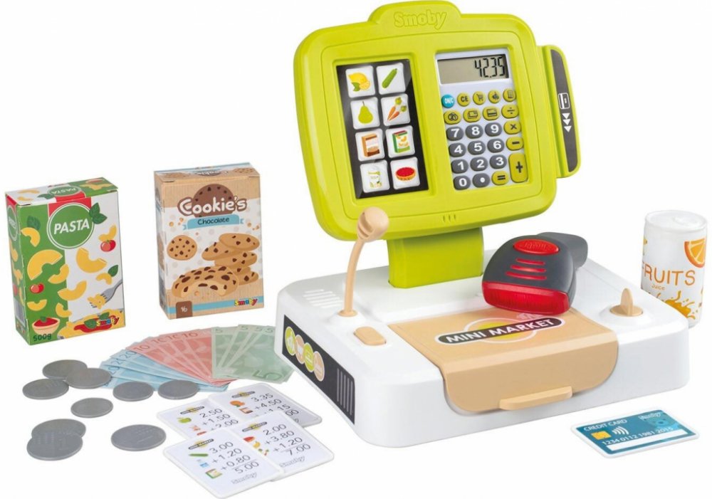 Elektronická dětská pokladna s funkcí skutečné kalkulačky, součástí skener, čtečka kreditních karet s účtenkou, mechanická váha, makety potravin, mikrofon. Hračka se světlem a zvukem, na baterie.