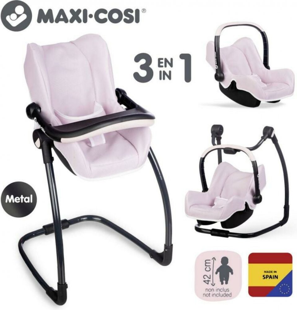 SB240242***Smoby Maxi-Cosi 3v1 Autosedačka a židlička pro panenky světle růžováAutosedačka Maxi-Cosi 3 v 1 pro panenky.Při zavěšení sedačky na konstrukci je rázem houpačka pro panenku do velikosti 42 cm. Otočením konstrukce získáte vysokou jídelní židličku s pultíkem.Rozměry (DxŠxV): 43 x 41 x 72 cm.-2025-
