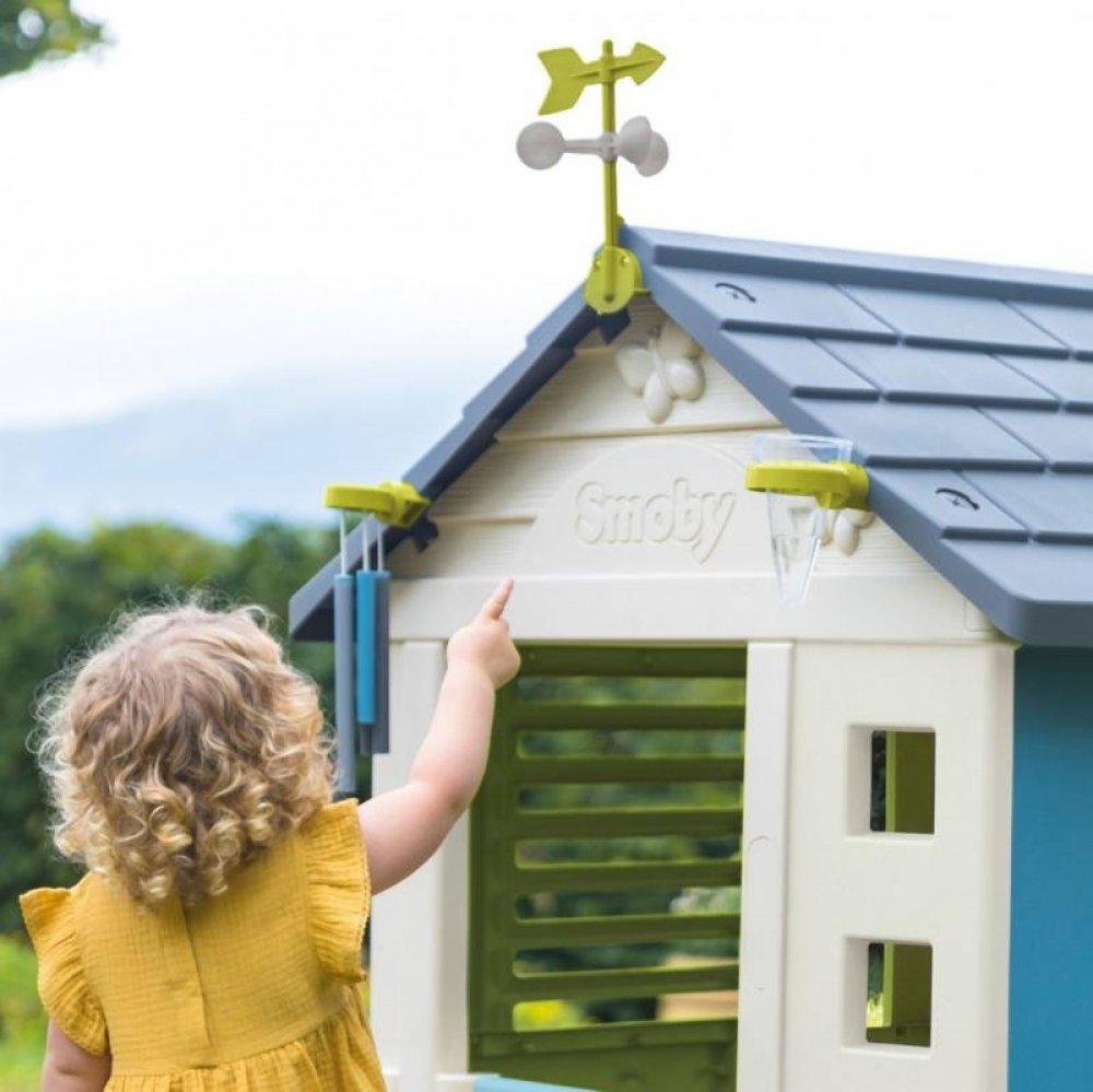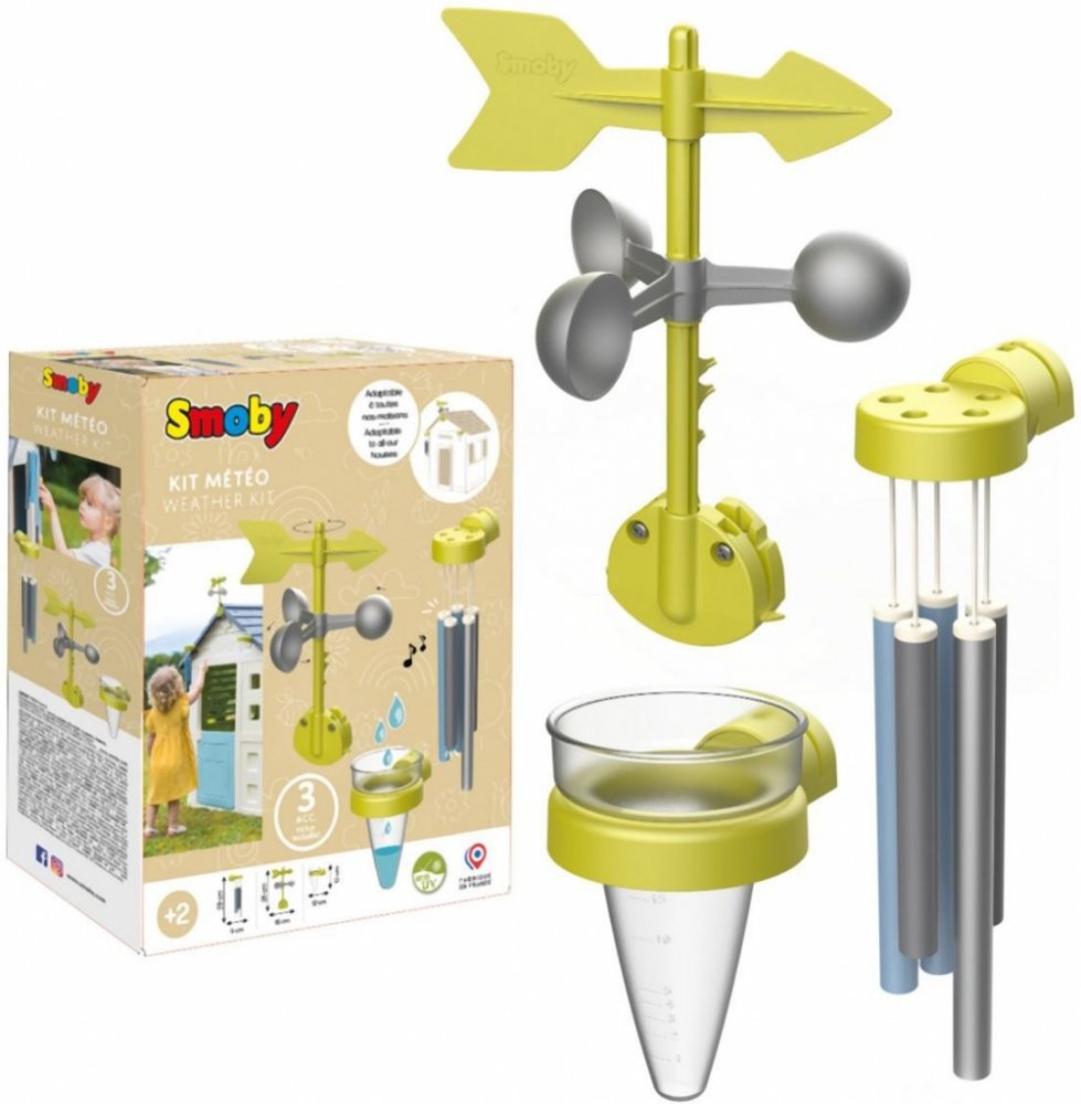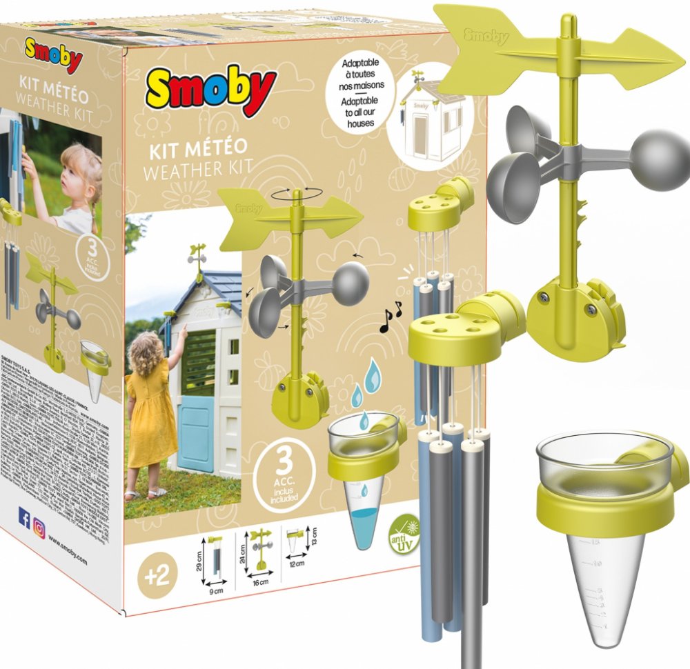 Vlastníte domeček Smoby? Pořiďte k němu hrací set od stejné značky. Součástí sady je zvonkohra, větrná korouhvička (anemometr) a srážkoměr s měrnou stupnicí. Váš potomek snadno zjistí, kterým směrem fouká vítr nebo kolik vody napršelo. Také si jistě rád poslechne tóny zvonkohry.