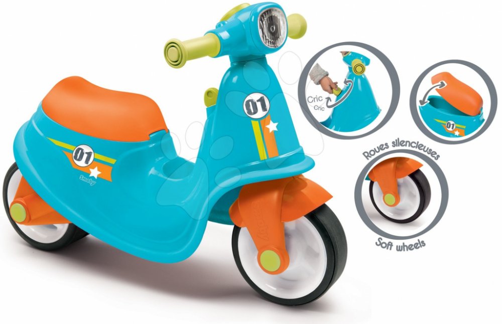 Odrážedlo - skútr v modré barvě s tichými kolečkami a úložným prostorem pod sedadlem. Klíč s mechanickou funkcí. Rozměry skútru: 64,5 x 34 x 47,5 cm. Hmotnost 2,4 kg.