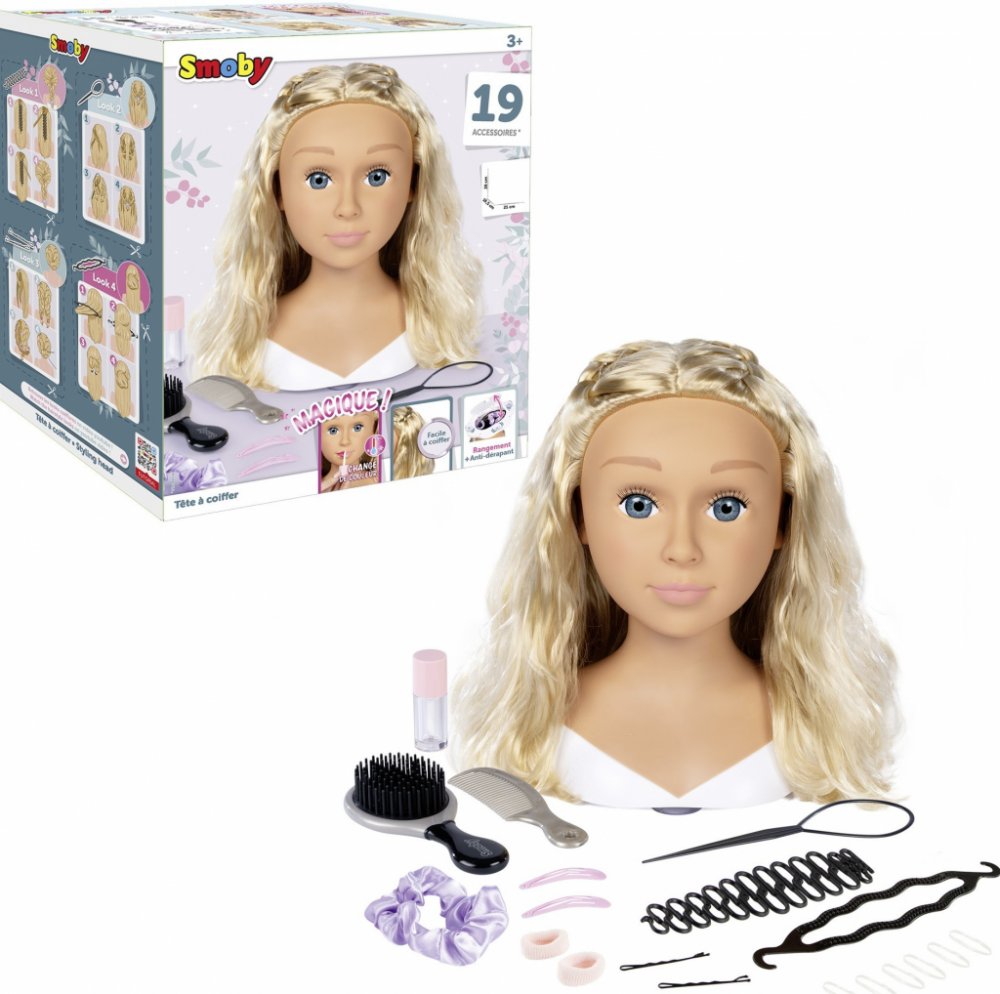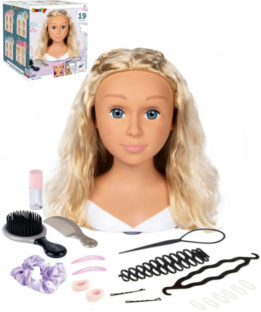S kadeřnickou hlavou Smoby My Beauty Blond se děti mohou ponořit do fascinujícího světa účesů a realizovat své kreativní nápady! Díky odolným a velmi měkkým nylonovým vlasům lze bez námahy vytvářet copy, drdoly a twisty, aniž by se vlasy zamotaly. Rozsáhlá kolekce 19 doplňků umožňuje vytvářet módní účesy: kartáč, hřeben, fialová látková gumička do vlasů, šest průhledných gumiček, dvě kovové sponky...