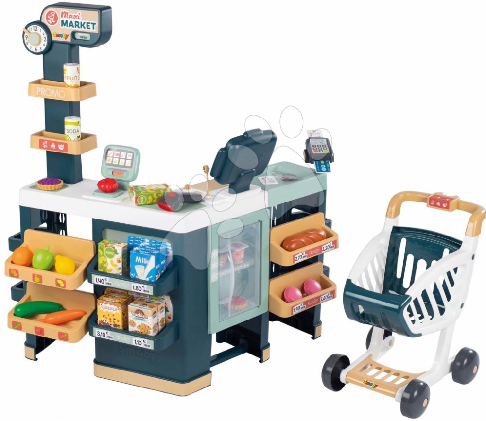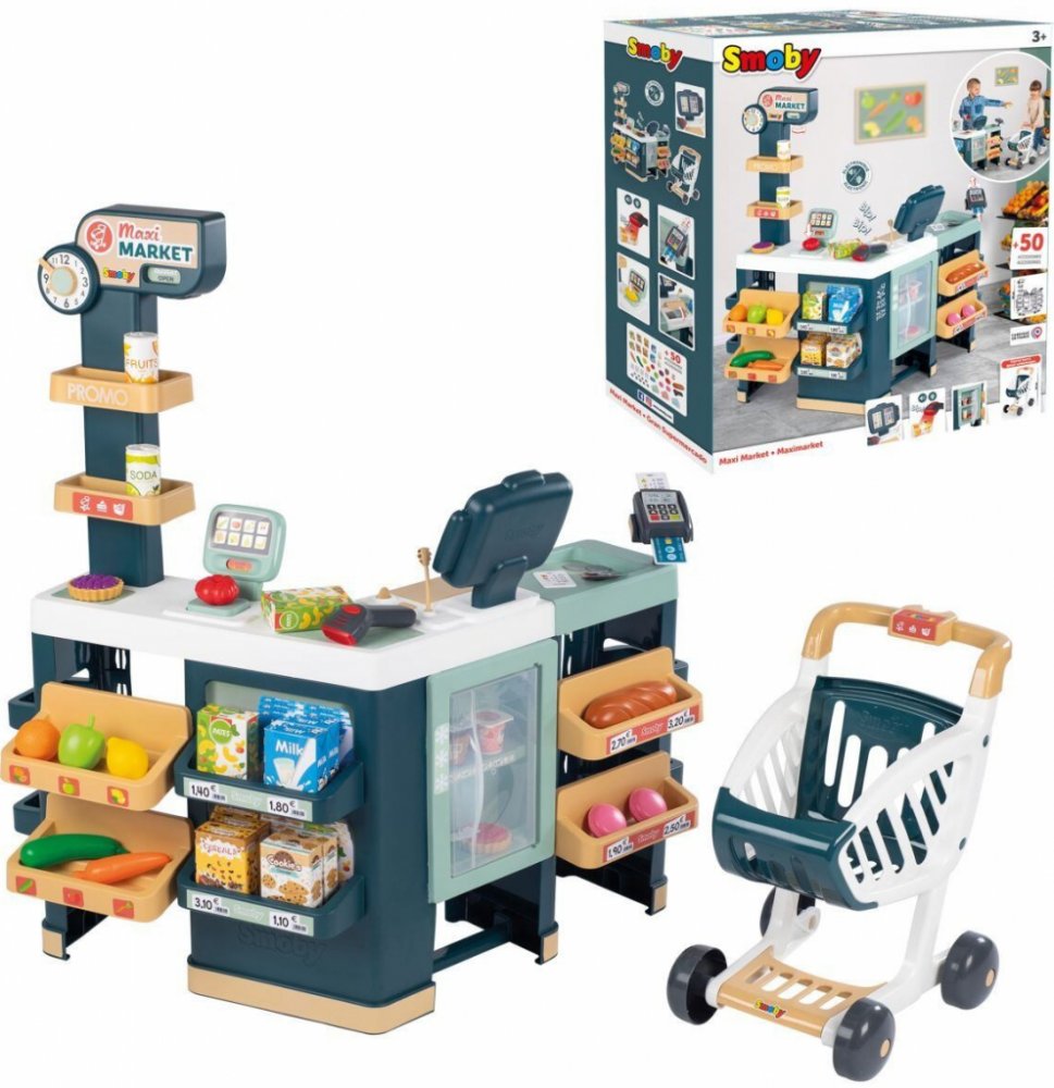 \nSmoby Maximarket z wózkiem Duży zestaw z kasą ze skanerem z dźwiękiem i światłem, wagą mechaniczną, czytnikiem kart kredytowych, drukarką do paragonów, wózkiem na zakupy, lodówką. W sumie 50 akcesor