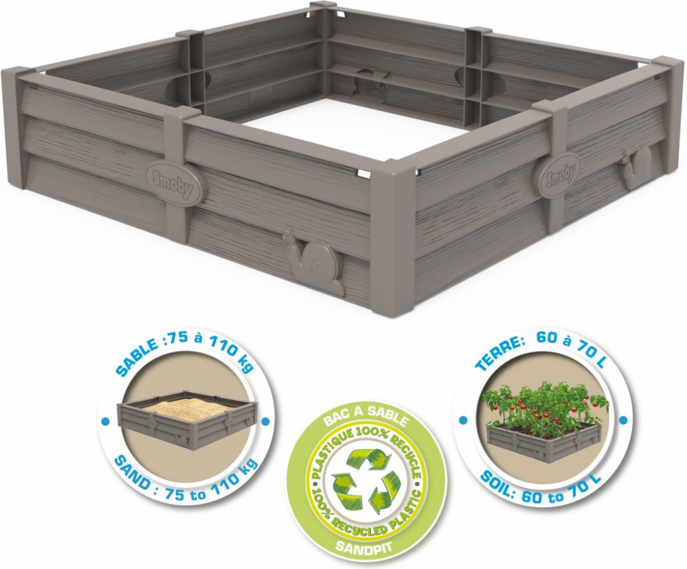 Pískoviště 2v1 Jednoduché a funkční pískoviště, které se může stát prostornou zeleninovou zahrádkou. Rozměry boxu: 76 x 76 cm. Přiložena je plachta, která chrání půdu pod pískovištěm. Pískoviště pojme 100 kg písku nebo 70 kg zeminy pro pěstování. 100, recyklovaný a recyklovatelný plast. Vyrobeno ve Francii. .