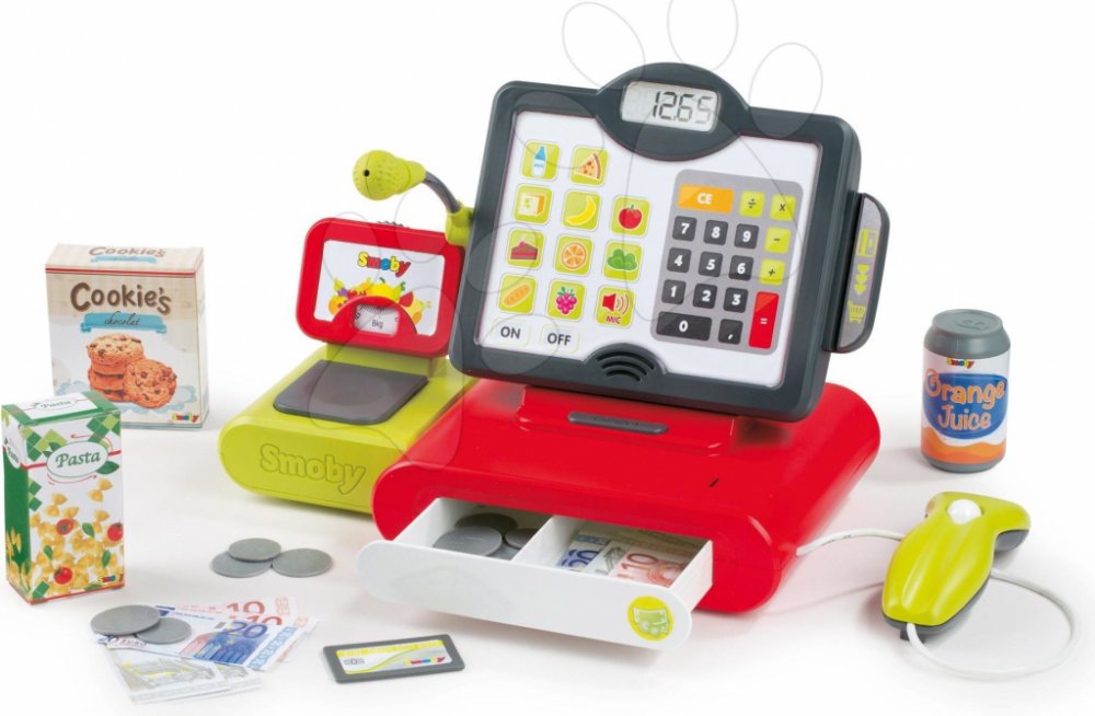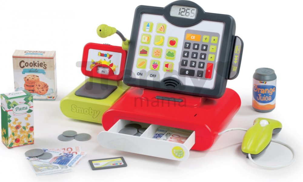 - obsahuje elektronickou pokladnu s dotykovým panelem a 25 doplňků (mince, bankovky, obaly, platební karty)