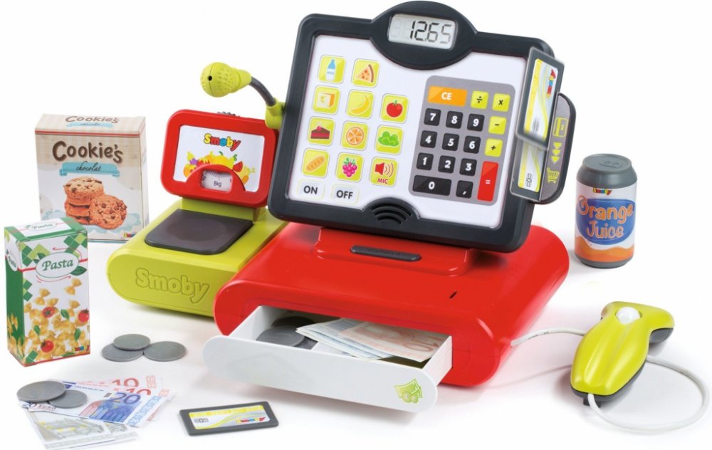 Hračka pokladna má všechny nejdůležitější prvky a funkce skutečného zařízení tohoto typu: skener kódů se světelným a zvukovým efektem, váha, čtečka karet a mikrofon. Na předním panelu pokladny se nachází šedé tlačítko, kterým lze pokladnu otevřít. Kromě toho je pokladna vybavena 6 různými zvukovými efekty. Součástí sady jsou také 3 balíčky, bankovky, mince a bankovní karta pro ještě větší zábavu.