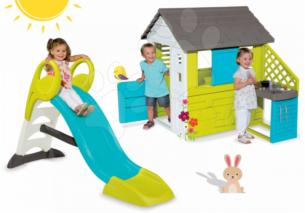 Set hraček Smoby je cenově výhodná sada hraček: domeček Pretty Blue s kuchyňkou a skluzavka Toboggan KS. Dětské zahradní hračky tvoří dokonalý celek, se kterým vašim dětem vytvoříte zábavné zahradní centrum.