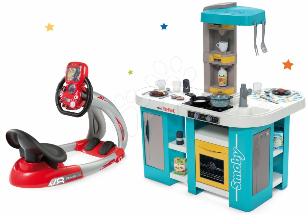 Smoby Set kuchyňka elektronická Tefal Studio 360° XL Bubble a trenažér V8 Driver se zvukem a světlem