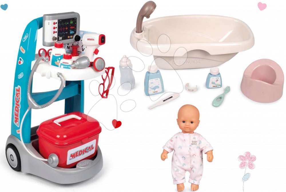 Máte doma dětičky a hledáte pro ně hezké dárky za rozumnou cenu? Set hraček, lékařský vozík elektronický Smoby a vanička s panenkou a doplňky, je oblíbený set hraček pro kluky i holky od 3 let, které s ním zažijí spoustu hodin kvalitní zábavy. Zvýhodněný set hraček potěší rodiče výbornou cenou a děti se budou radovat z nových, krásných hraček. S hračkami v setu si zahraje i několik dětí, sourozenců i kamarádů a zároveň jim pomohou s rozvojem fantazie, představivosti a jemné motoriky.