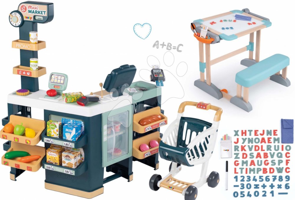 Smoby Set obchod elektronický smíšené zboží s chladničkou Maxi Market a dřevěná lavice na psaní a kreslení s 80 doplňky