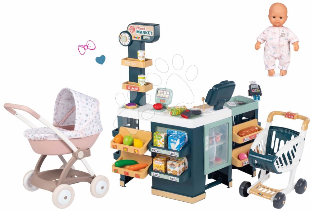 Smoby Set obchod elektronický smíšené zboží s chladničkou Maxi Market a hluboký kočárek s textilním potahem a 32 cm panenka