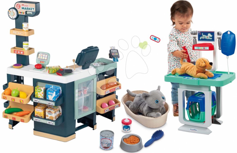 Obchod elektronický s chladničkou Maxi Market a zvěrolékařský vozík s pejskem a pelíškem pro kočičku představují skvělou sadu hraček pro děti již od 3 let. Hračky v setu od francouzských výrobců Smoby a Écoiffier spolu designově a barevně ladí, vydrží vašim nejmenším dlouhá léta. Obchod s elektronickým skenerem zabaví děti při hře na obchodníky a prodavače, těšit se mohou i na zvěrolékařský vozík a plyšová zvířátka. Hravým způsobem se přibližují světu dospělých, získají realistické zážitky, rozvíjejí si logické myšlení a jemnou motoriku.