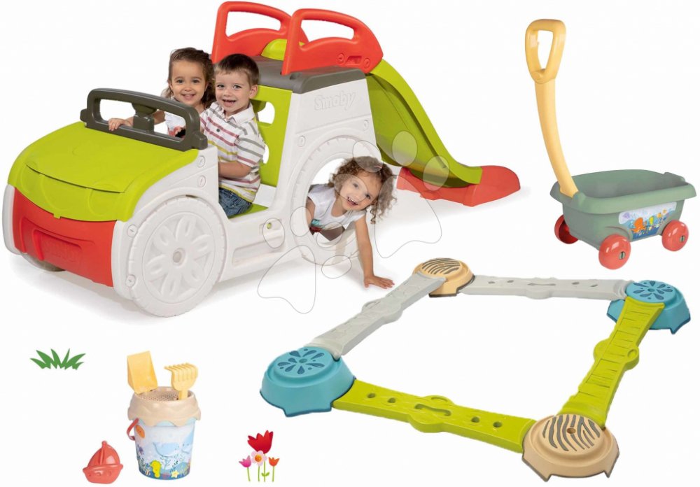 Set hraček Smoby tvoří vynikající multifunkční prolézačka Adventure Car a dobrodružná dráha s vozíkem na tahání. Hračky pocházejí od francouzského výrobce Smoby, který dbá na vysokou kvalitu a originalitu svých výrobků. Hračky v setu barevně a designově a spolu vytvoří jedno dokonalé zábavné hrací centrum, se kterým děti od 18 měsíců stráví venku dlouhé hodiny a zabaví se během celého léta.