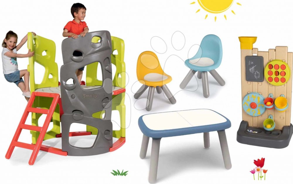 Set prolézačka Multiactivity Climbing Tower se skluzavkou, hrací stěna s aktivitami a stůl se dvěma židlemi KidChair je špičková sada hraček pro chlapce a dívky od 2 let. Hračky v setu od renomovaného výrobce Smoby jsou vyrobeny z kvalitních materiálů a zabaví se s nimi několik dětí, sourozenci i kamarádi. Hračky v setu se navzájem barevně i designově doplňují, stanou se ozdobou každé zahrady.