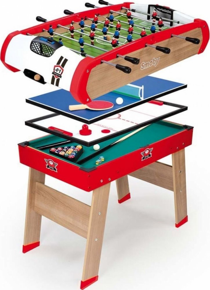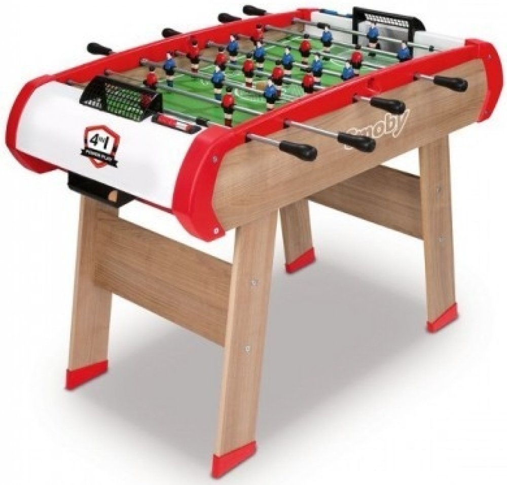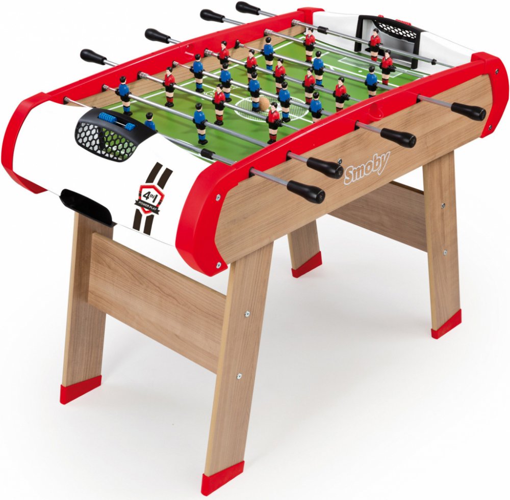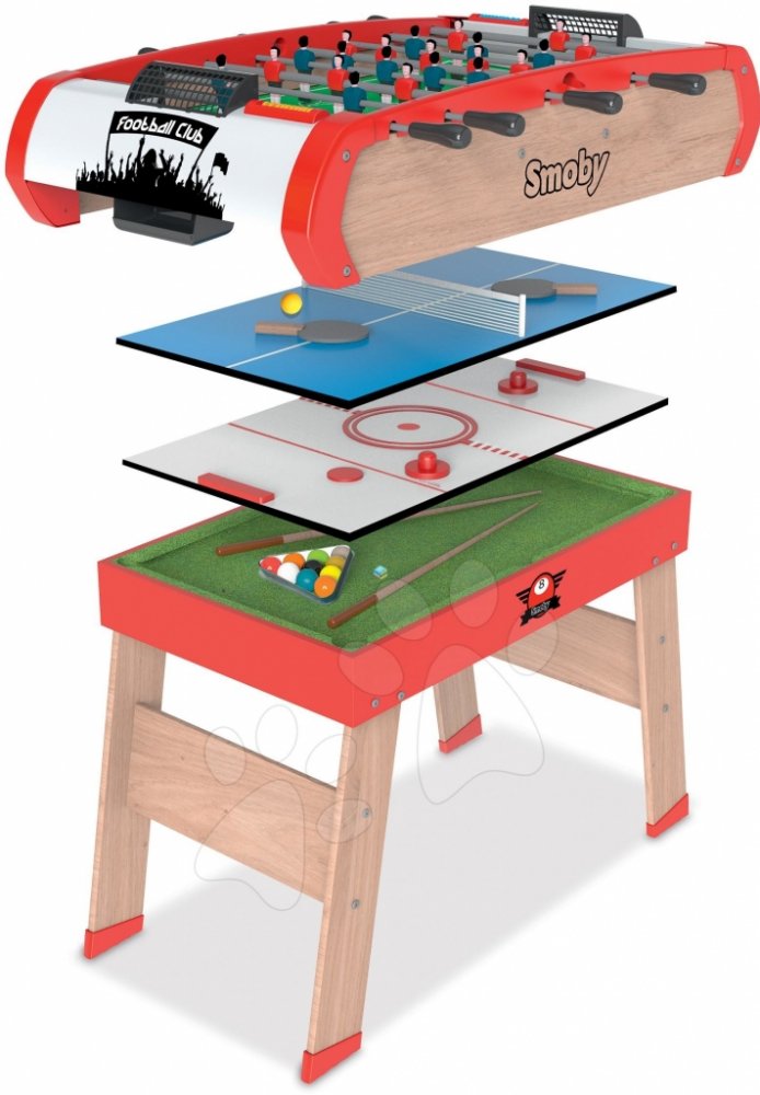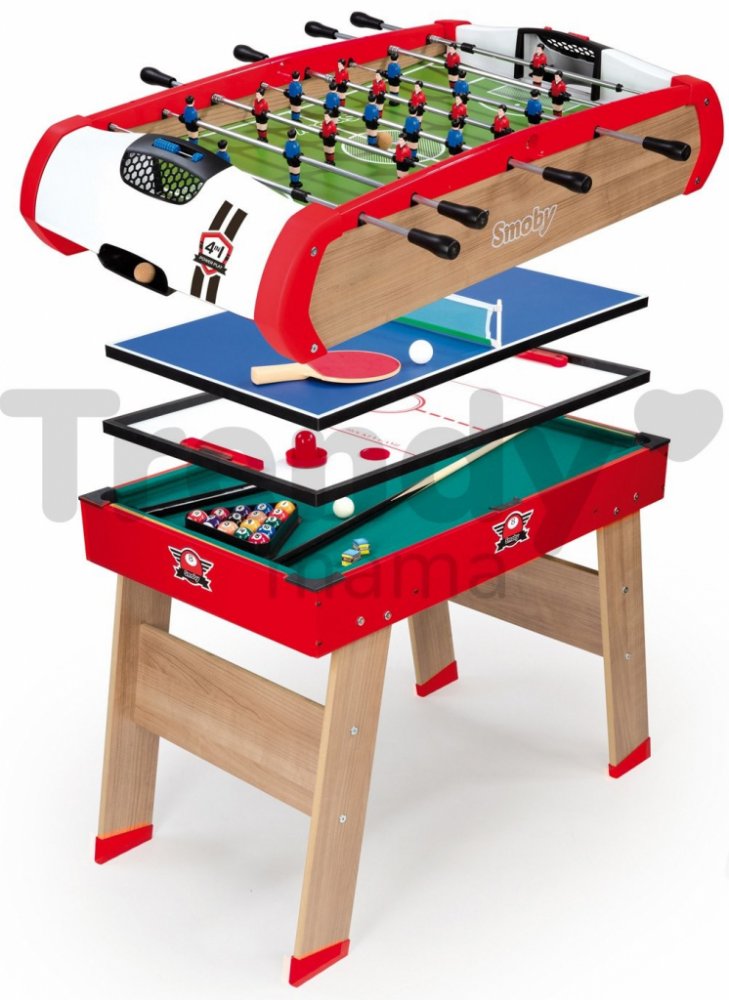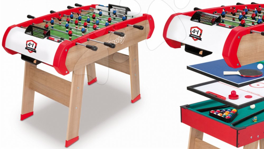 Multifunkční hrací stůl Smoby je vyroben z těch nejkvalitnějších materiálů, takže je velmi bezpečný a maximálně stabilní. Jeho moderní design, skvělé detaily a nezbytné pomůcky na 4 různé sporty zlákají na hru každého člena rodiny. Prostřednictvím sportovních her fotbalu, hokeje, tenisu a kulečníku se rozvíjí jemná motorika, koncentrace, trpělivost dětí. Také se mohou učit o dodržování pravidel, o základních pravidlech těchto sportů. Hraní fotbalu a ostatních 3 her podněcuje i zdravou soutěživost, děti se chtějí zlepšovat, chtějí být nejlepší. Je to výborná hračka, při níž se dítě hravým způsobem rozvíjí a zabaví se s ní a se svými kamarády velmi dlouho, proto neváhejte a zakupte ji i svým ratolestem.