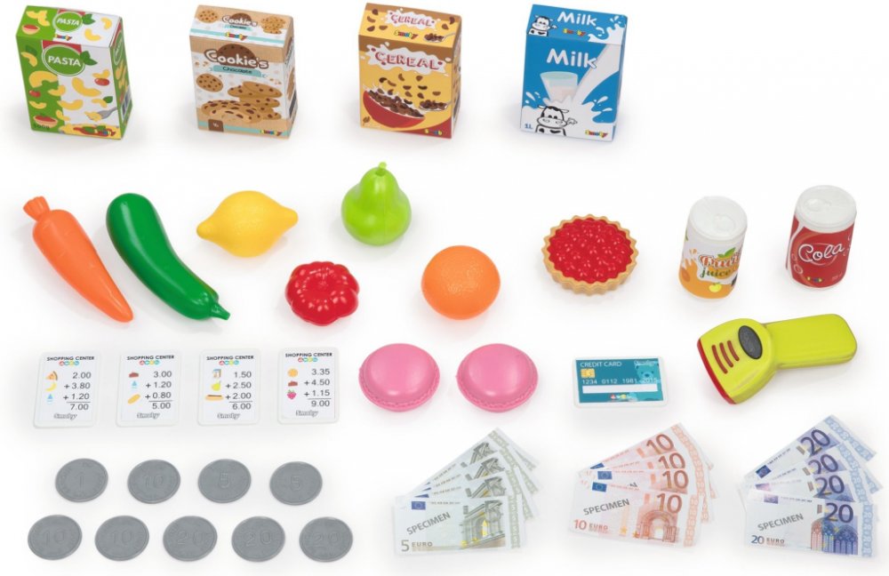 Nákupní vozík, makety potravin, ovoce a zeleniny a hodiny jsou součástí kuchňky. Nechybí klíček k pokladně, mince, bankovky a platební karta.