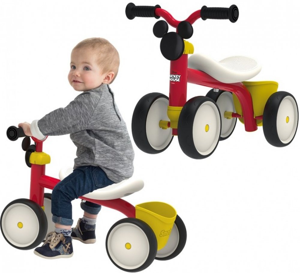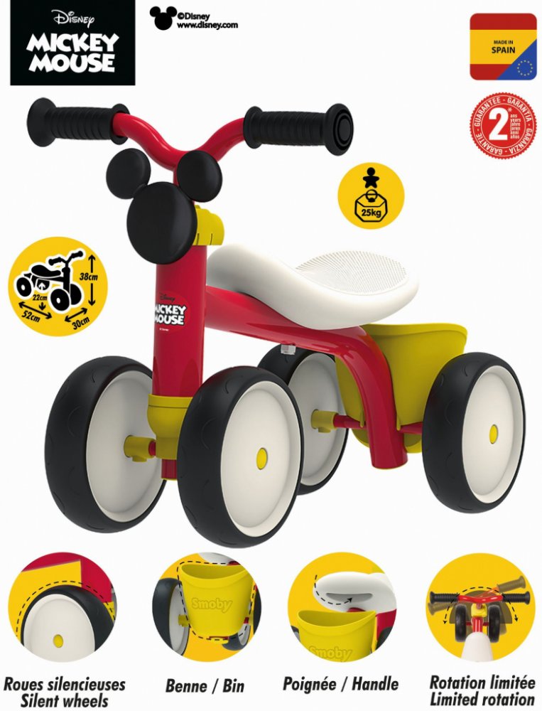 S tvarovaným vozítkem Smoby Micky Rookie mohou batolata podnikat své první samostatné výlety na čtyřech kolech. Plyšové vozítko si svým klasickým designem Disneyho Mickeyho získá srdce dětí i rodičů. Díky robustnímu kovovému rámu je stylové vozítko Rookie mimořádně robustním a bezpečným společníkem, jakmile malí kluci udělají své první krůčky. Protože kromě velké porce zábavy při jízdě a prvních výletů směrem k mobilitě trénuje dětské vozidlo také motorické dovednosti a sebedůvěru potomků tím, že trénuje řízení, brzdění, zatáčení a změnu směru potřebnými pohyby nohou. Pro snadnou přepravu má Smoby slide praktické madlo pro přenášení pod ergonomicky tvarovaným sedadlem z vysoce kvalitního plastu. Tvar banánu zabraňuje sklouznutí dítěte dopředu a dítě sedí pohodlně ve správné poloze. Čtyři tichá, bezúdržbová kolečka EVA umožňují tichý pohyb. Klouzací vozidlo je navíc vybaveno malým úložným boxem, ve kterém se může oblíbená hračka vydat na dobrodružnou cestu. Omezení řízení zajišťuje bezpečné ovládání a stabilitu i při zatáčení ve vysoké rychlosti. Ochrana proti nárazu na měkkých bezpečnostních rukojetích spolehlivě chrání malé ruce. Vyrobeno ve Španělsku. Pořiďte si Smoby a další značky a licence za nejlepší ceny! Doporučený věk: + 1 rok Pohlaví: Pro děti Typ: Autíčko na ježdění