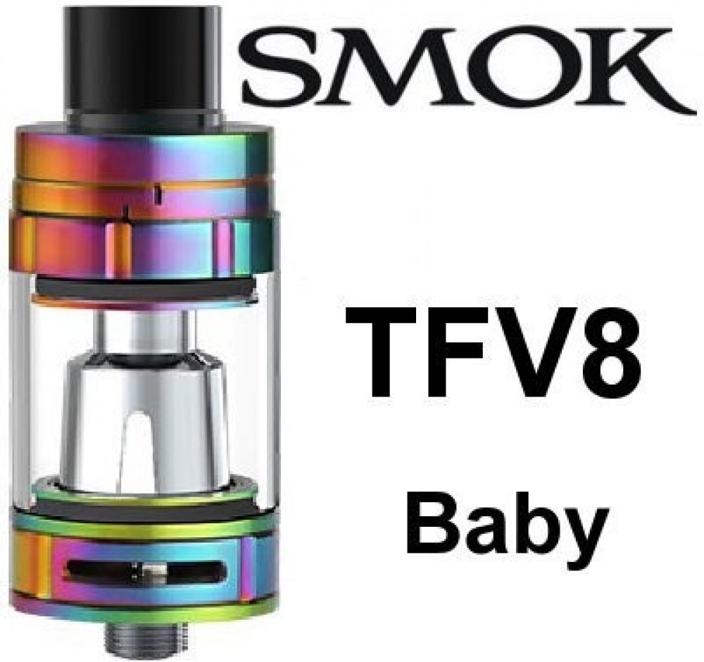 Není určeno pro náplně obsahující nikotin! TFV8 Baby patří mezi menší clearomizery od Společnosti Smoktech, avšak jeho velikost nemá žádný vliv na jeho velké množství tvorby páry a perfektní podání chuti liquidu. Využívá horní plnění bez jakéhokoliv šroubování...po pootočení horní části plníte otvorem přímo do těla clearomizeru (viz foto v příloze). Celý clearomizer je vyroben z nerez oceli a Pyre...