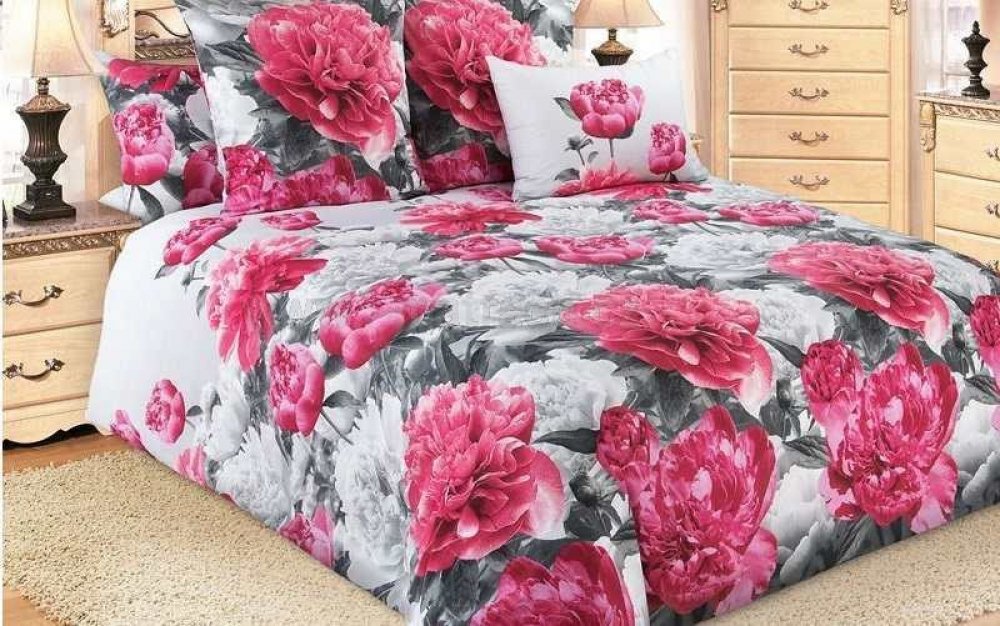 Velké syté květy pivoňky výrazně doplňují bílo šedé pozadí pivoňkových květů a listů. Povlečení je výrazné, ale nijak vyzývavé.