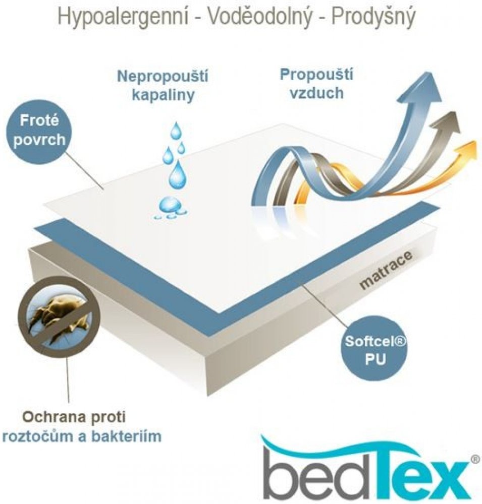 Ochrana proti tekutinám i roztočům: - chránič matrace je s PU zátěrem Softcel® - na spodní straně nepropustí žádnou kapalinu - chrání matraci před zašpiněním - zabezpečuje matrace před množením bakterií a roztočů - matr...