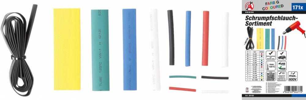 pro rychlou opravu, chrání kabely před vlhkostí a korozí v plastovém kufříku rozsah dodávky: 25 smršťovacích bužírek O 2,0 mm, délka 30 mm, červená 25 smršťovacích bužírek O 2,0 mm, délka 30 mm, černá 25 smršťovacích bužírek O 2,0 mm, délka 30 mm, bílá 25 smršťovacích bužírek O 2,0 mm, délka 30 mm, zelená 10 smršťovacích bužírek O 4,0 mm, délka 60 mm, modrá 10 smršťovacích bužírek O 4,5 mm, délka 60 mm, černá 8 smršťovacích bužírek O 5,0 mm, délka 60 mm, červená 6 smršťovacích bužírek O 6,0 mm, délka 60 mm, bílá 11 smršťovacích bužírek O 8,0 mm, délka 90 mm, bílá 11 smršťovacích bužírek O 9,0 mm, délka 90 mm, modrá 7 smršťovací bužírky O 12,0 mm, délka 90 mm, zelená 7 smršťovacích bužírek O 18,0 mm, délka 90 mm, žlutá 1 smršťovací bužírky O 10,0 mm, délka 1000 mm, černá