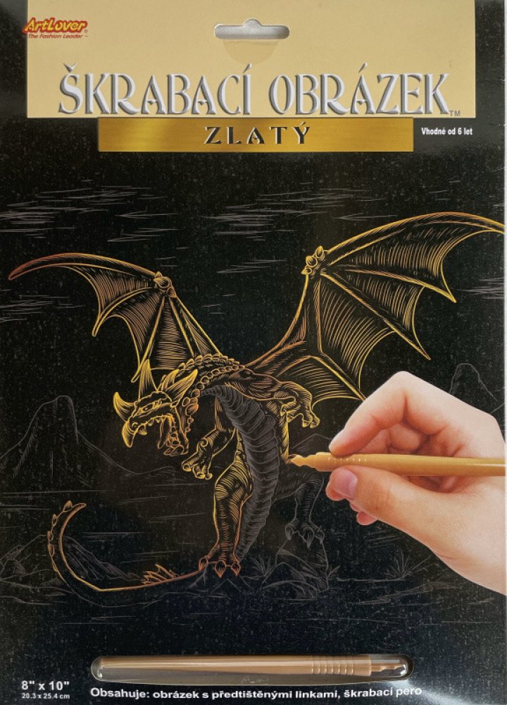 Škrabací obrázek zlatý 20 x 25 cm Sada obsahuje obrázek natištěný na černém kartonu a umělohmotné škrabací pero. Seškrabte linky předtištěného obrázku. Vhodné pro děti od 6 let.