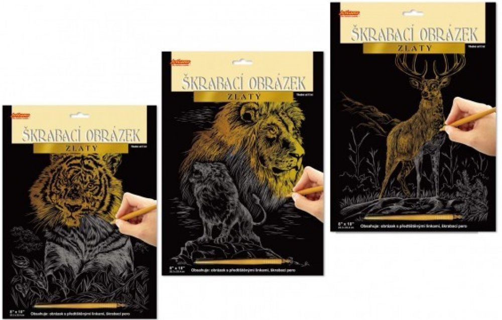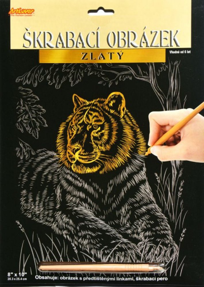 Přiloženým škrabacím perem vyškrábejte linky předtištěného obrázku.Balení obsahuje:obrázek se spodní zlatou vrstvou (rozměry 20 x 25 cm), plastové škrabací