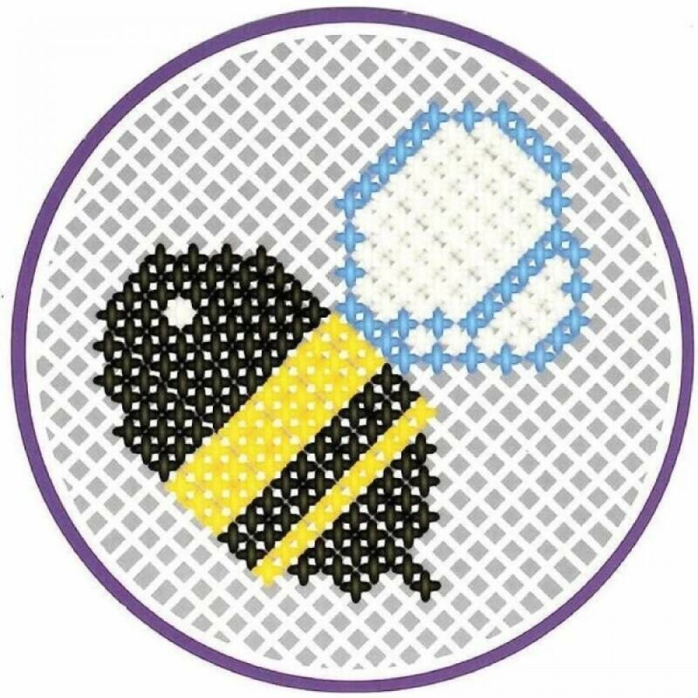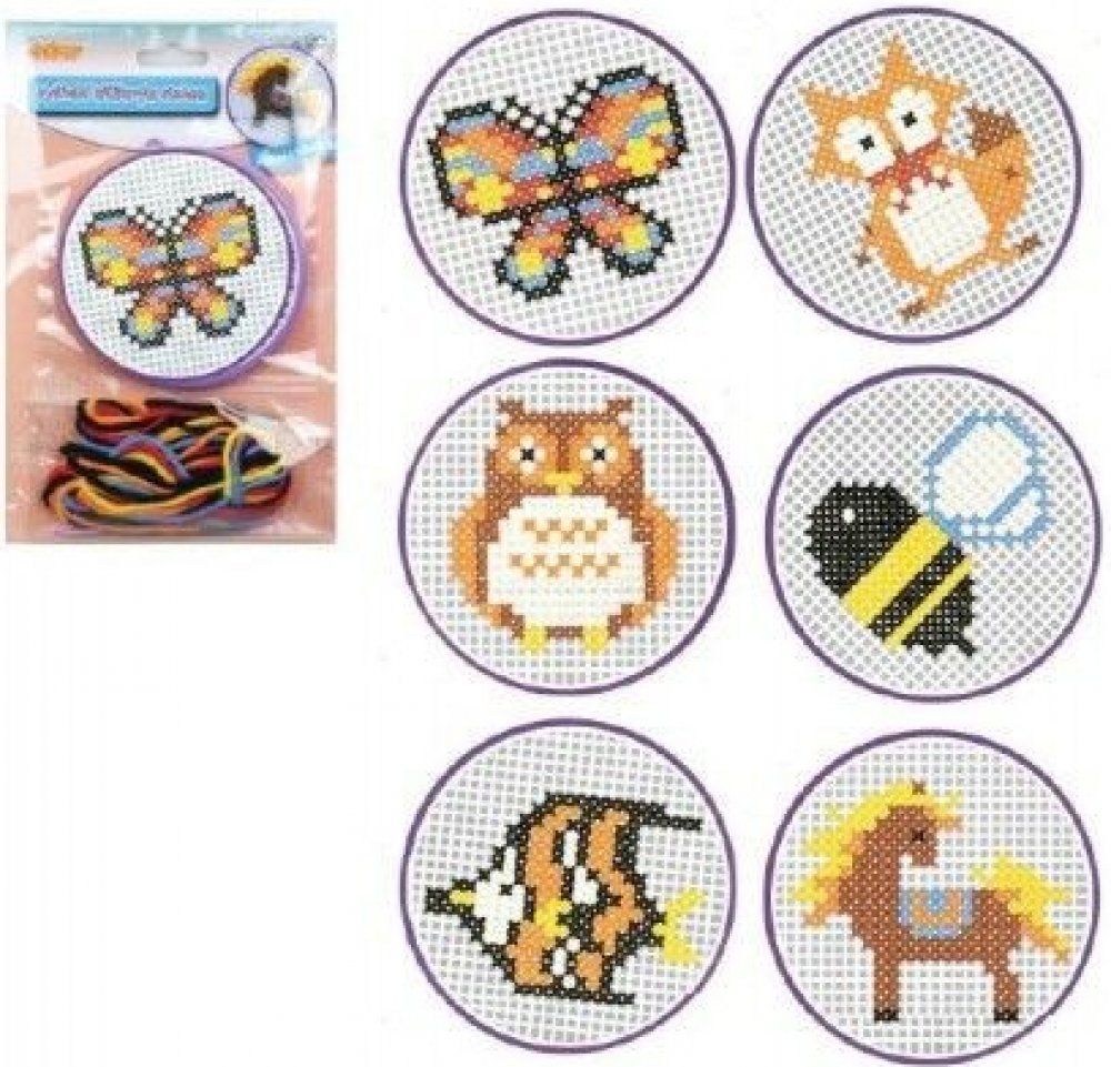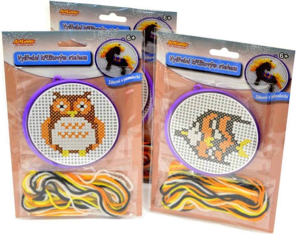 Jednoduché vyšívání křížkovým stehem. Provlékněte jehlou bavlnku a na konci udělejte uzlík. Vyšívejte obrázek podle předlohy křížkovým stehem. Obrázek vyšijte na plastovou destičku, která je přiložena v balení. Ukončete uzlíkem a pořádně utáhněte.