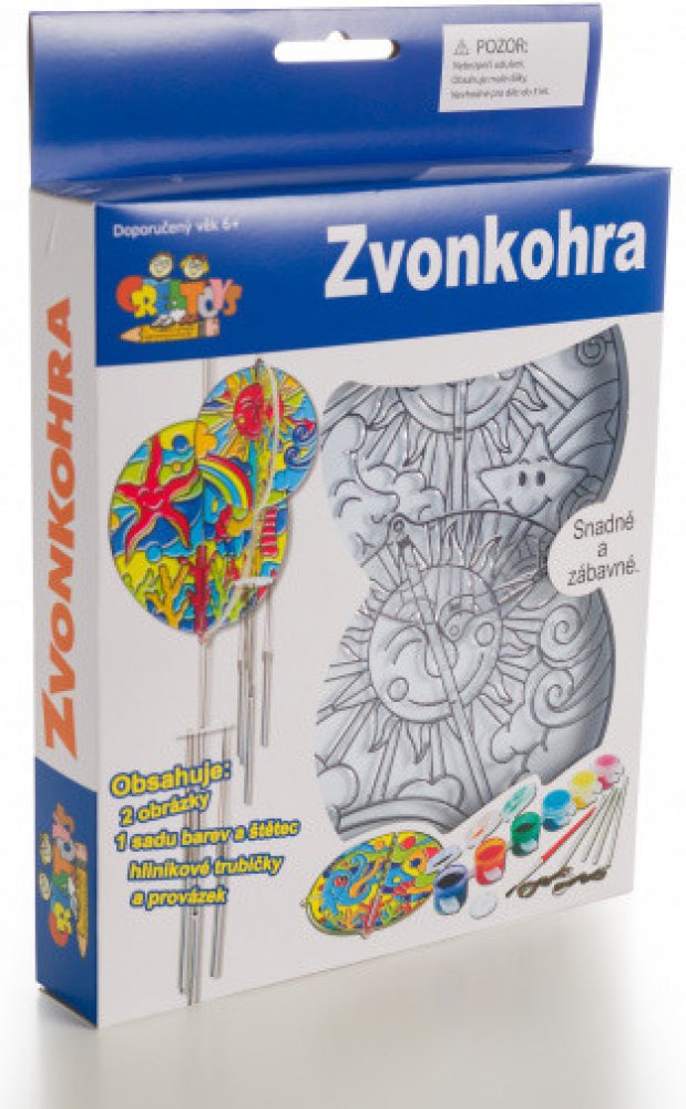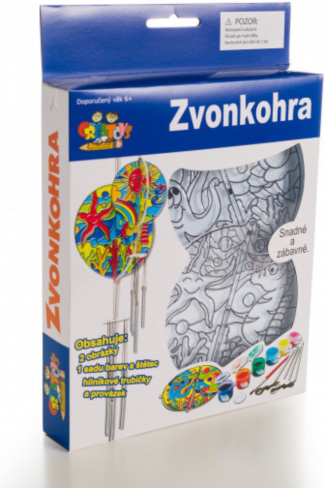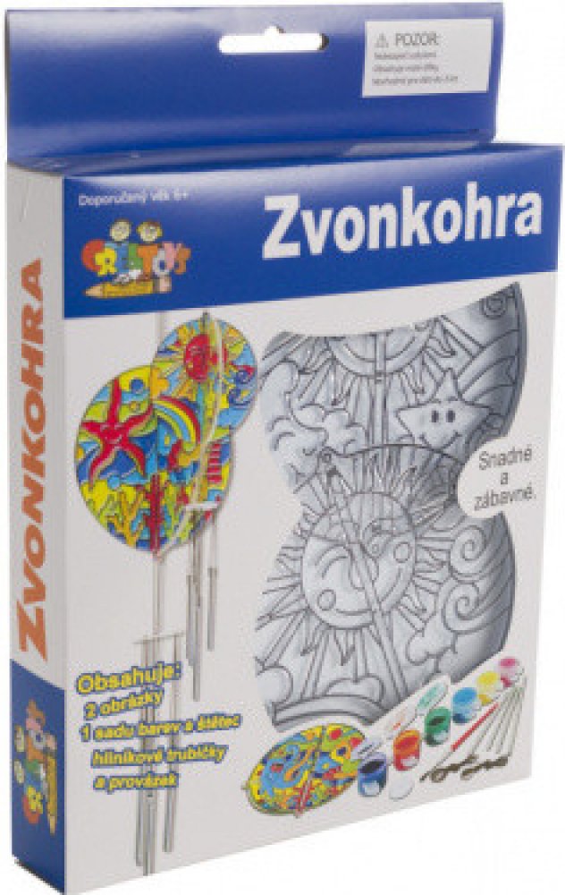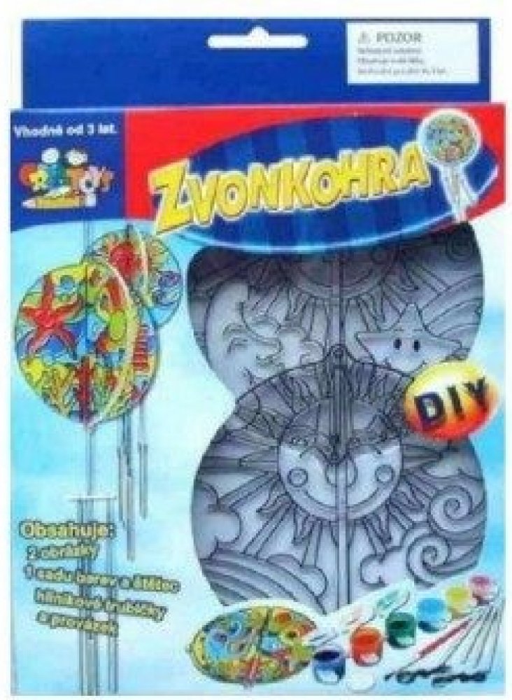 Kreativní sada na vytvoření krásné barevné zvonkohry udělá radost všem dětem. Sada obsahuje dva průhledné plastové díly s ohraničenými políčky, které děti vybarvují podle vlastní fantazie přiloženými akrylovými barvami. Sada dále obsahuje hliníkové trubičky a provázek. Velikost balení je 16 x 25 x 2,5 cm.Malování zvládnou i velmi malé děti, jednotlivá políčka jsou ohraničena vystouplým okrajem a barvu tak snadno aplikují. Dodáváme ve dvou provedeních – s motivem slunce nebo mořského světa – bez možnosti výběru.