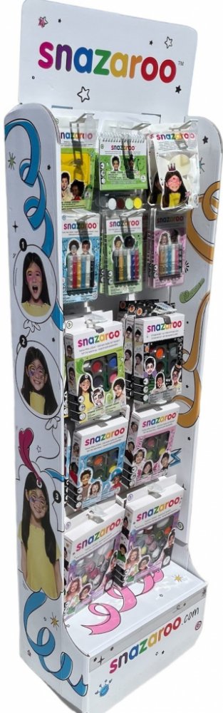 Stojan Snazaroo obsahuje: 1172032 Velká party sada - 4x1172028 Sada barev Halloween - 3x1172029 Sada barev v zelené barvě, unisex - 3x 1172030 Sada barev v modré barvě, chlapecké - 3x1172031 Sada barev v růžové barvě, dívčí - 3x1174003 A6 obličejové barvy s postupem - 4x1198010 Bílé houbičky 2 ks v balení - 4x 1172035 Obličejové barvy v tužce unisex - 3x1172037 Obličejové barvy v tužce, dívčí - 3x1172038 Obličejové barvy v tužce, chlapecké - 3x1198012 Šablony na obličejové barvy, žluté - 4x 1198013 Šablony na obličejové barvy, oranžové - 4x 1198014 Šablony na obličejové barvy, růžové - 4x Buďte kreativní s jedním z našich snadno pochopitelných průvodců a šablon nebo si vytvořte vlastní nápady! • Namočte houbu a/nebo štětec do trochy vody. Naneste trochu barvy.Když dobrodružství vašeho dítěte skončí, stačí jej omýt mýdlem a vodou. • Používejte pod dohledem dospělé osobyVýrobce Snazaroo Velká BritánieOd založení Snazaroo v roce 1989 vždy šlo o kvalitu a bezpečnost...Abychom vám umožnili odemknout svět kreativity, vyžadují produkty, kterým můžete důvěřovat. Proto je kvalita a bezpečnost srdcem každého produktu Snazaroo a my jsme odhodláni vyrábět vysoce kvalitní barvy na obličej. Naše řada barev na obličej a tělo je na vodní bázi, bez parfemace, snadno se odstraňuje a je vytvořena tak, aby byla šetrná k citlivé pokožce.Žádný z našich produktů nebyl nikdy testován na zvířatech.Barvy jsou vyvinuté z prémiových ingrediencí, které splňují nejvyšší standardy kvality a splňují přísné předpisy EU a FDA, garantujeme kvalitu každého produktu prostřednictvím pravidelného testování nezávislými dermatology a odborníky na toxikologii.Snazaroo vám umožní s jistotou dosáhnout jakéhokoliv motivu na obličej a tělo.Velikost stojanu je 163 x 45 x 28 cm.