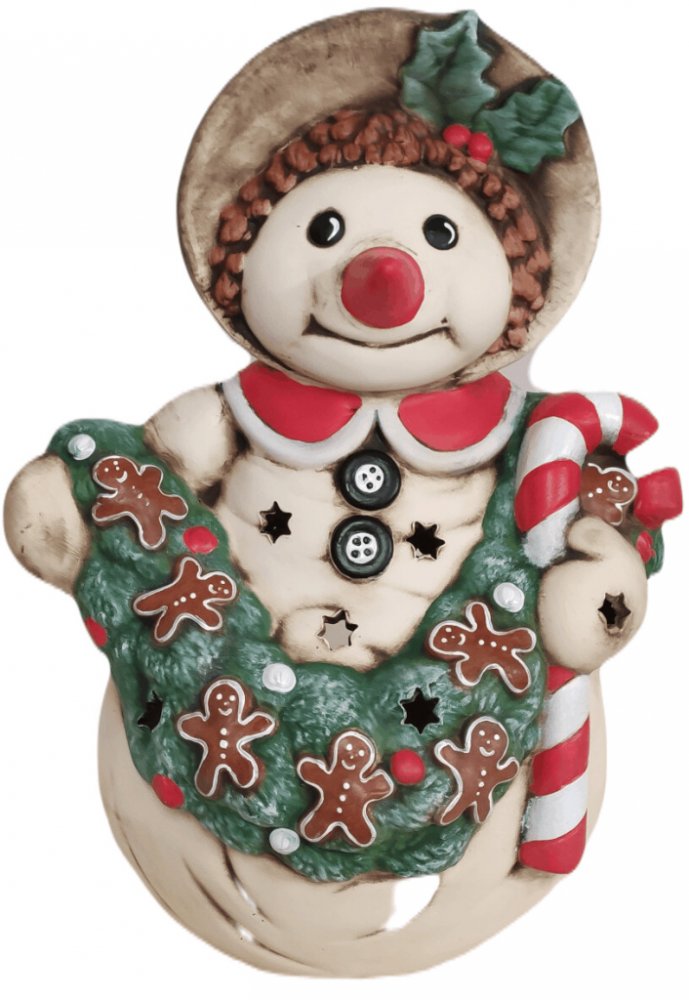 Sněhulka keramická vysoká. Zahradní vánoční keramika. Keramická světelná dekorace – na čajovou svíčku. Česká ruční práce, každý kus je originál a jedinečný. Světelná dekorace která rozjasní nejen zimní dny a večery. Výrobky odolávají povětrnostním podmínkám. Výška 54 cm, hloubka 37 cm, šířka 28 cm. Materiál keramika.