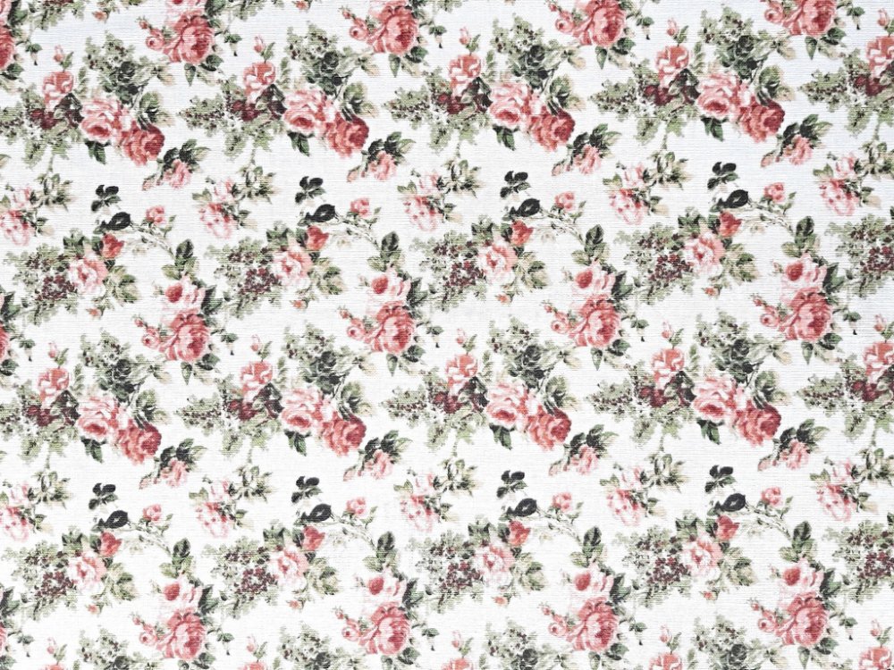 100% lněné plátno s potiskem růží na bílém pozadí. Růže jsou menší a vzor je jemný. Bílý podklad je s nádechem krémové. Plátno je měkčené, jemné a příjemné na dotek. Potisk je jednostranný.
